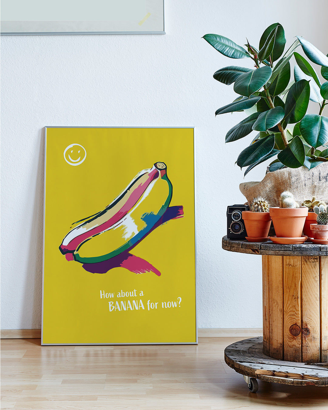 鮮やかな黄色を背景に、バナナが大胆に描かれたポスターは、インテリアに元気を与えるポップアートの一枚です。