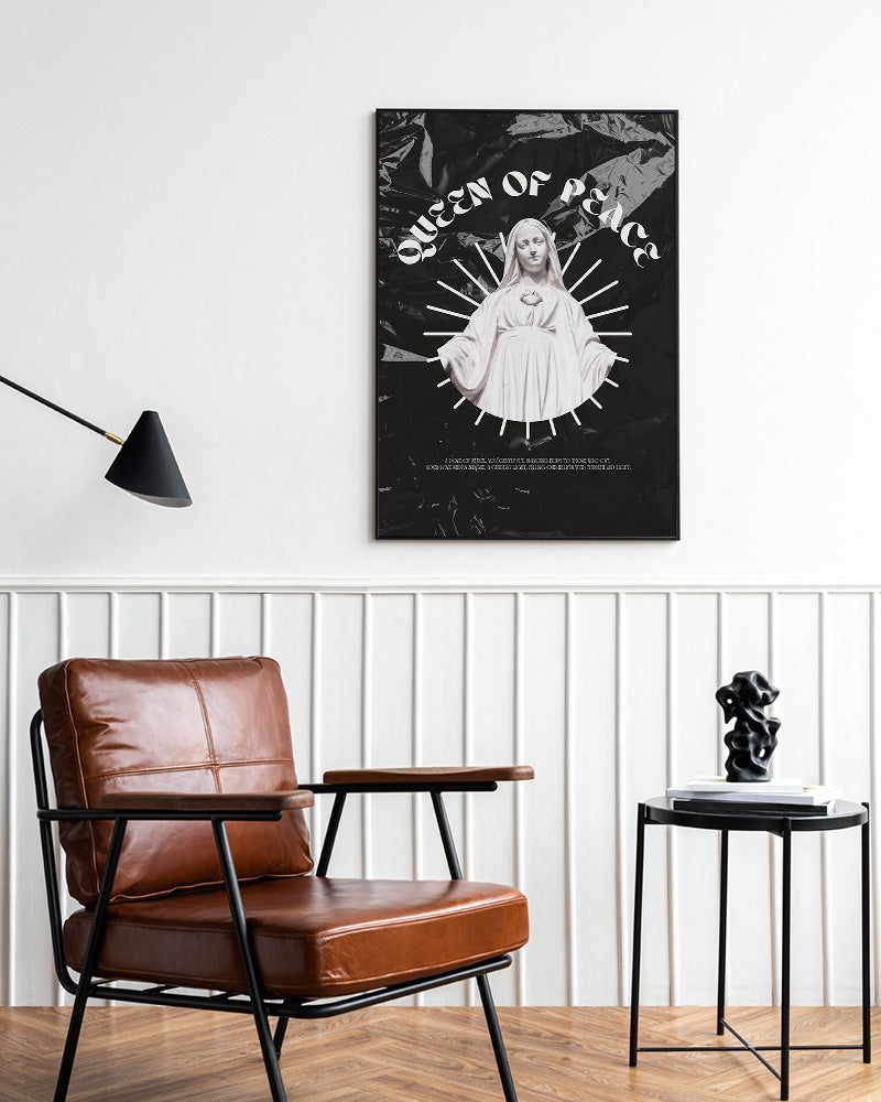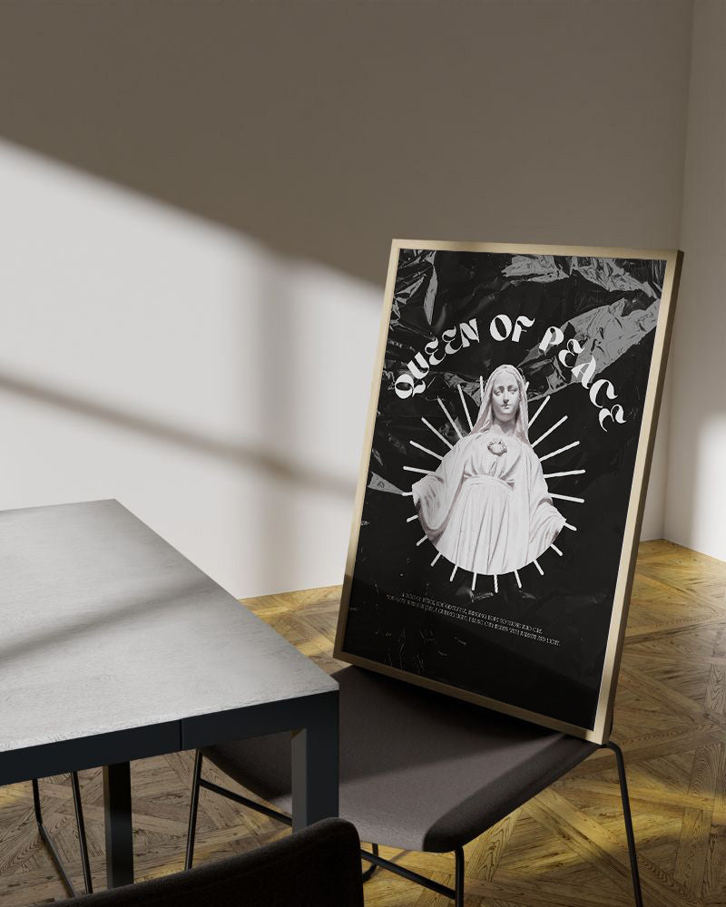 荘厳なマリア像と「QUEEN OF PEACE」の文字が印象的な、神秘的なアートポスター。