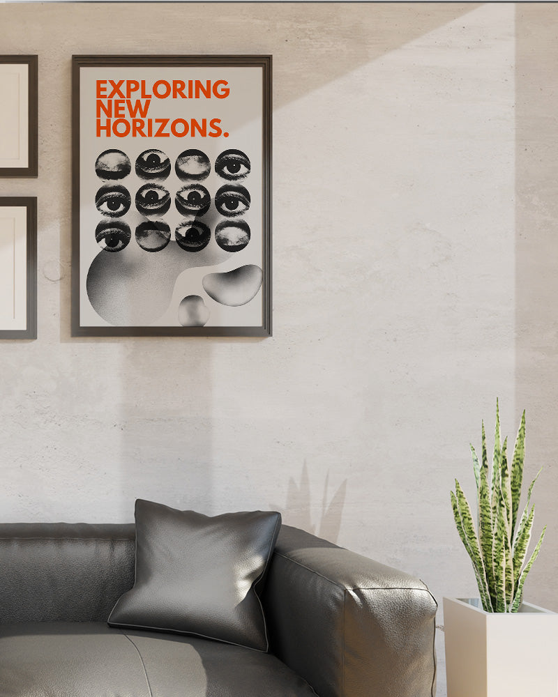 「EXPLORING NEW HORIZONS(新たな地平を探る)」という力強いメッセージと、モノクロの目のコラージュが印象的なシュールレアリスム調のアートポスター。