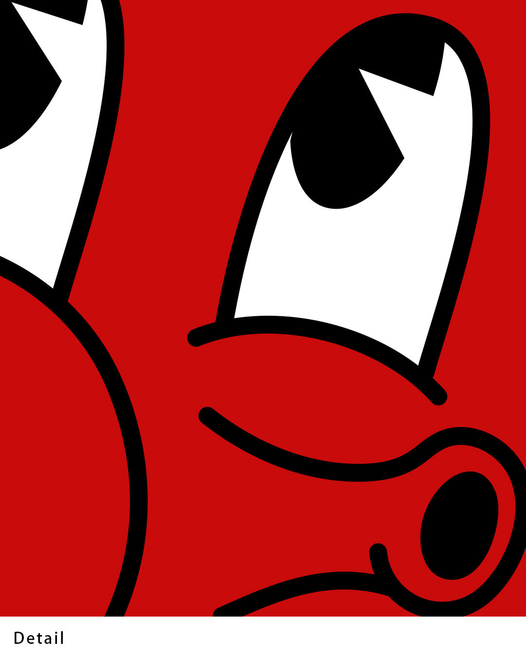 鮮烈なレッドの背景に、シンプルなラインで描かれたユーモラスなタコの表情が印象的なアートポスター。