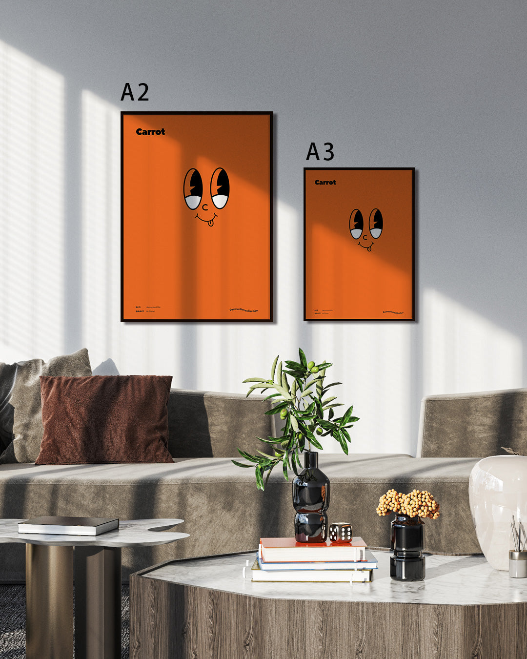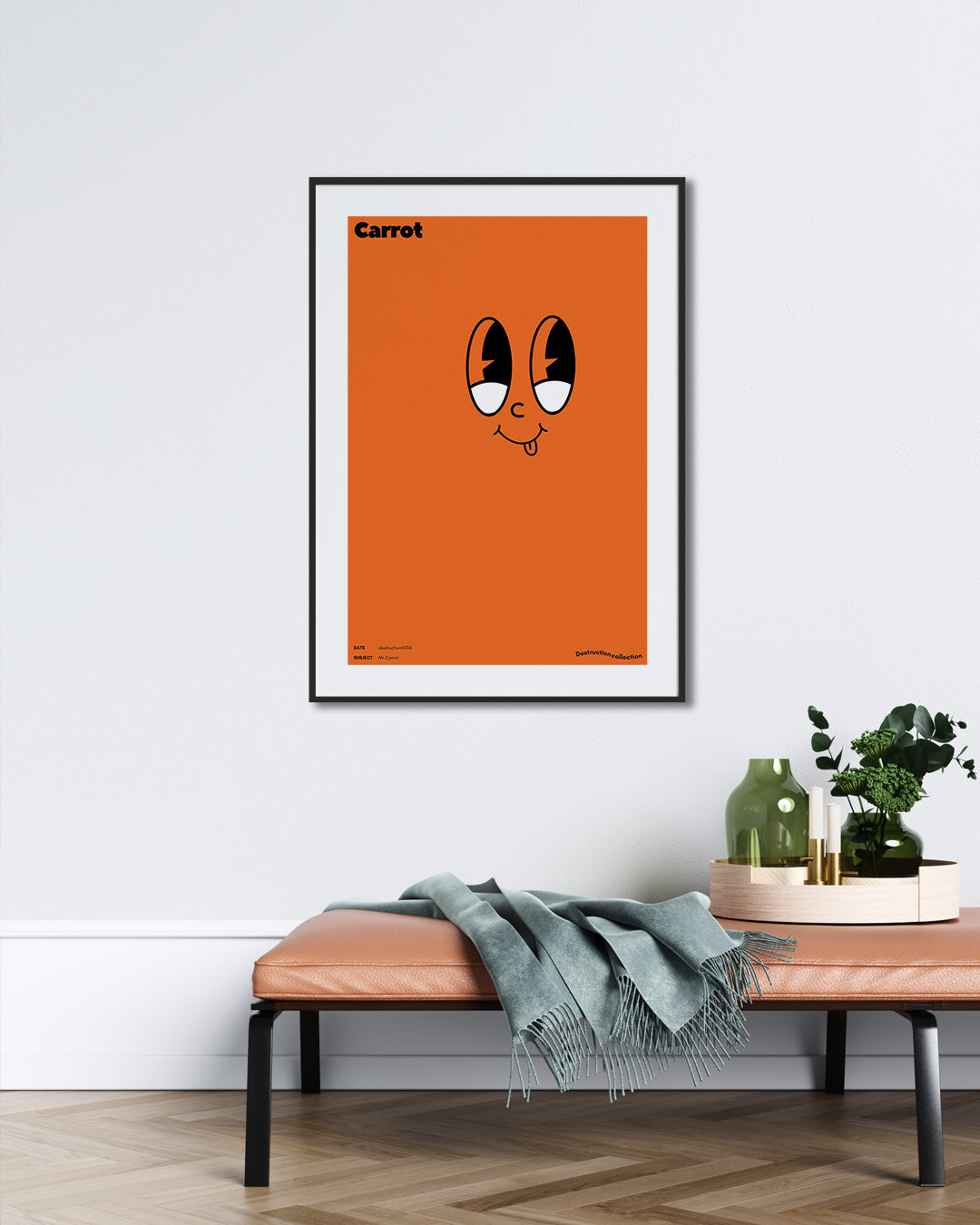 にんじんをイメージした鮮やかなオレンジの背景に、愛らしい表情が浮かぶミニマルアートポスター。