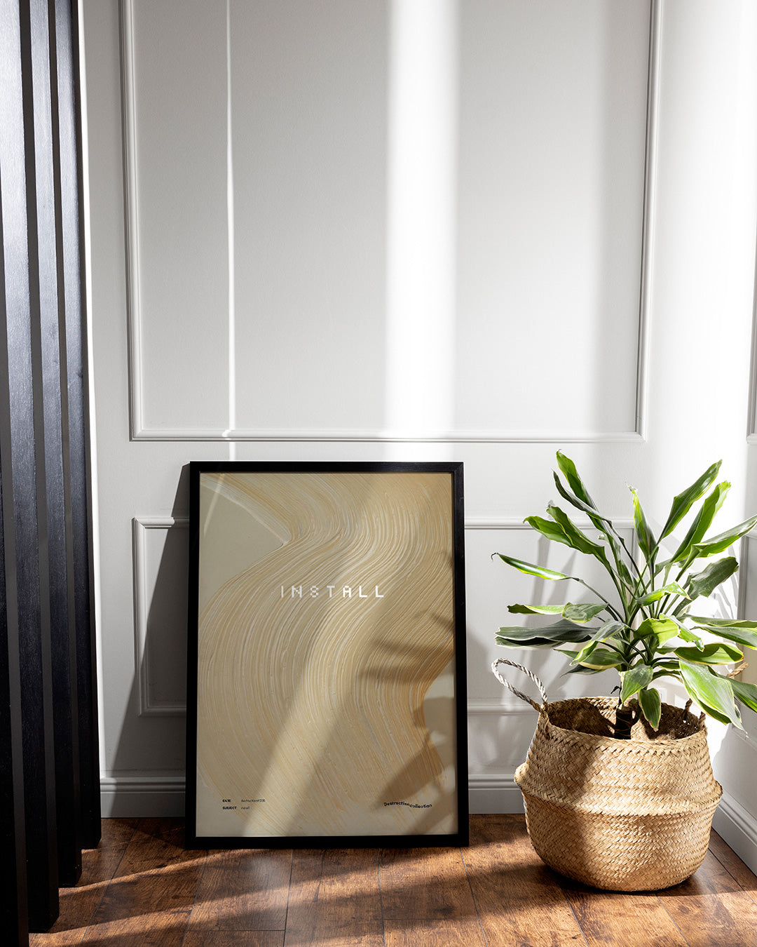 ソフトなベージュの背景に、流れるような筆のストロークが描かれたミニマルなアートポスター。