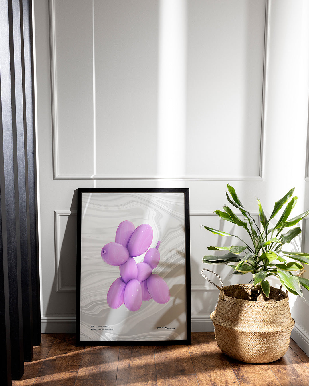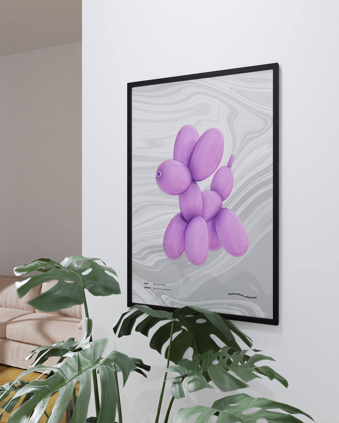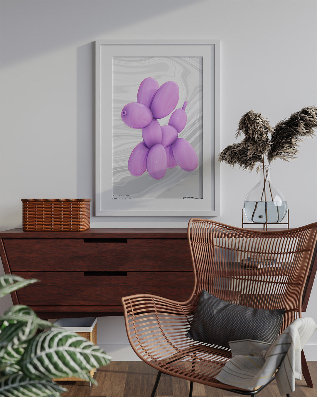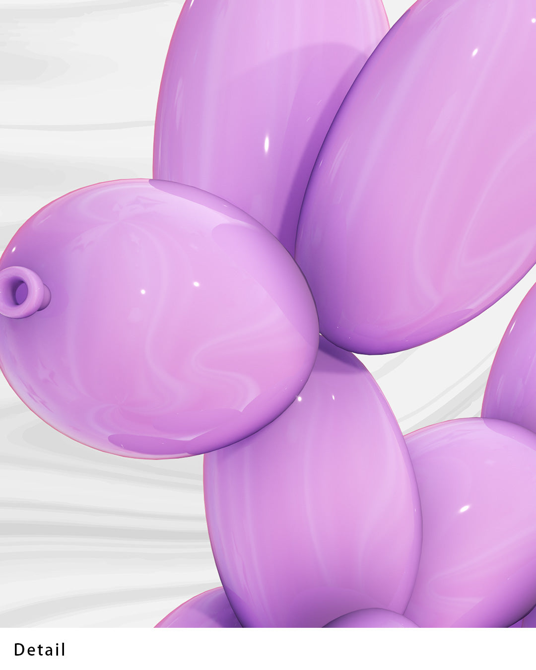淡いラベンダー色のバルーンアートが、マーブル調の背景の中で浮かぶように配置されたコンセプチュアルなアートポスター。