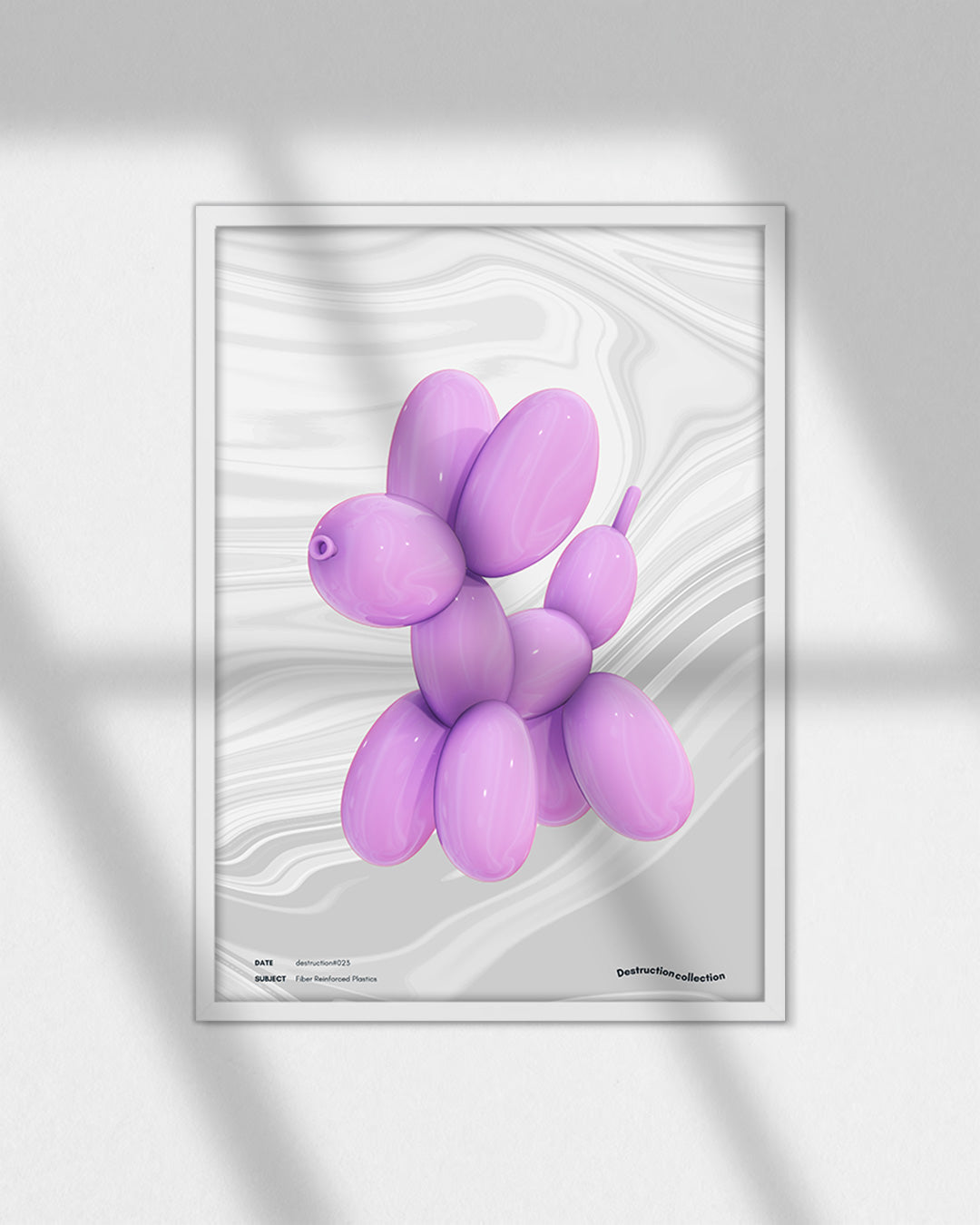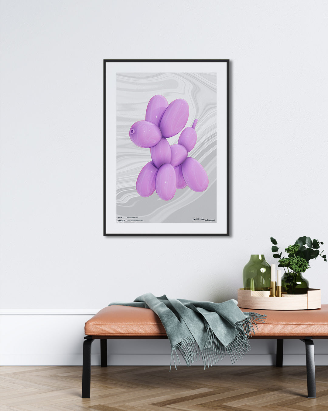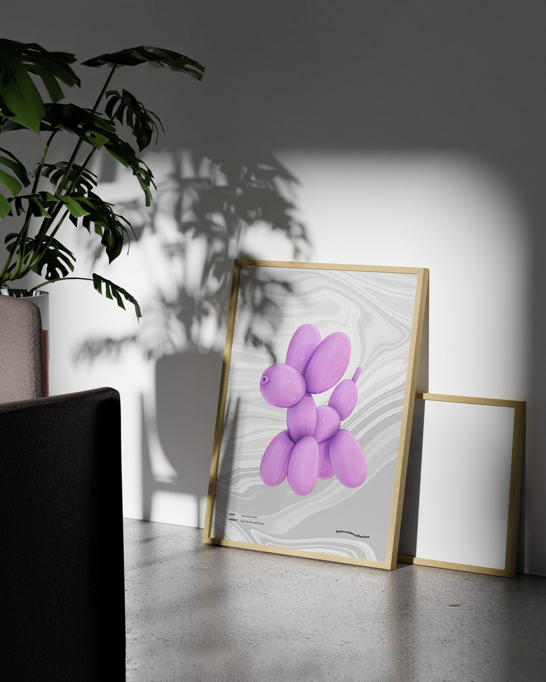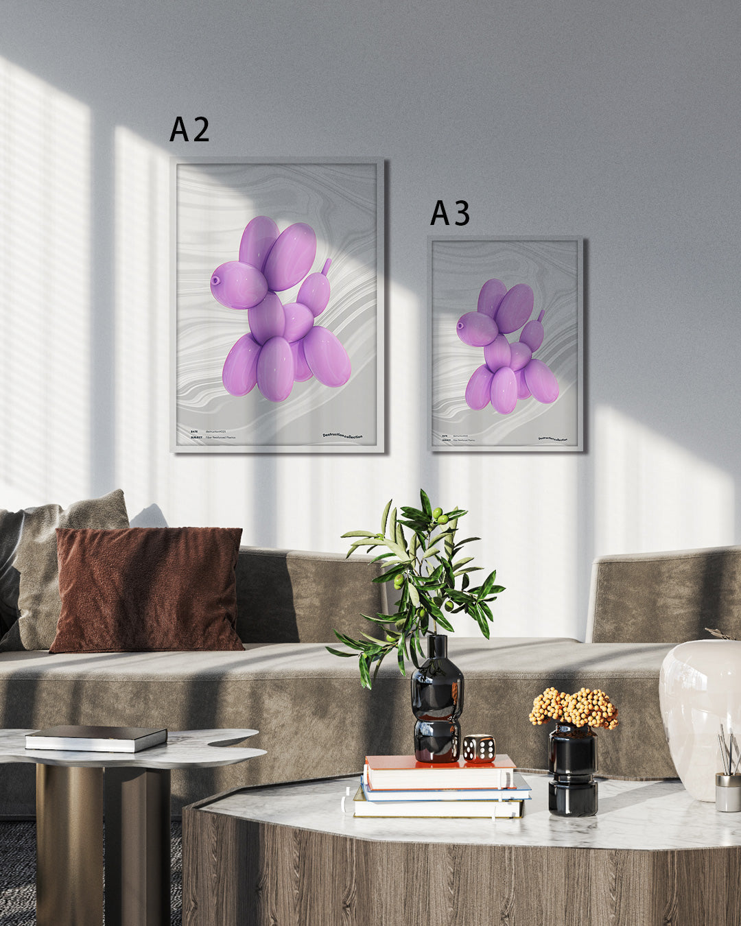 淡いラベンダー色のバルーンアートが、マーブル調の背景の中で浮かぶように配置されたコンセプチュアルなアートポスター。