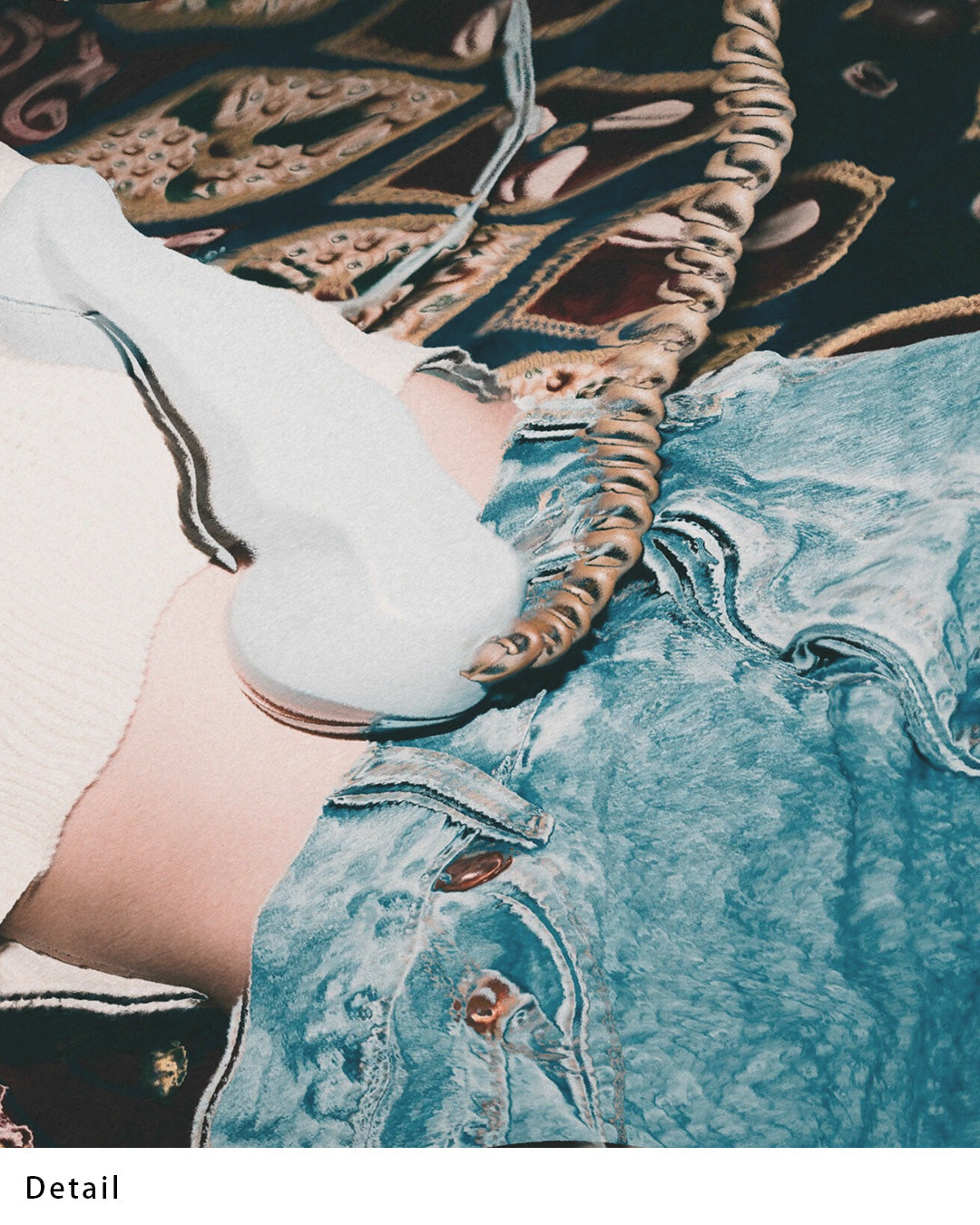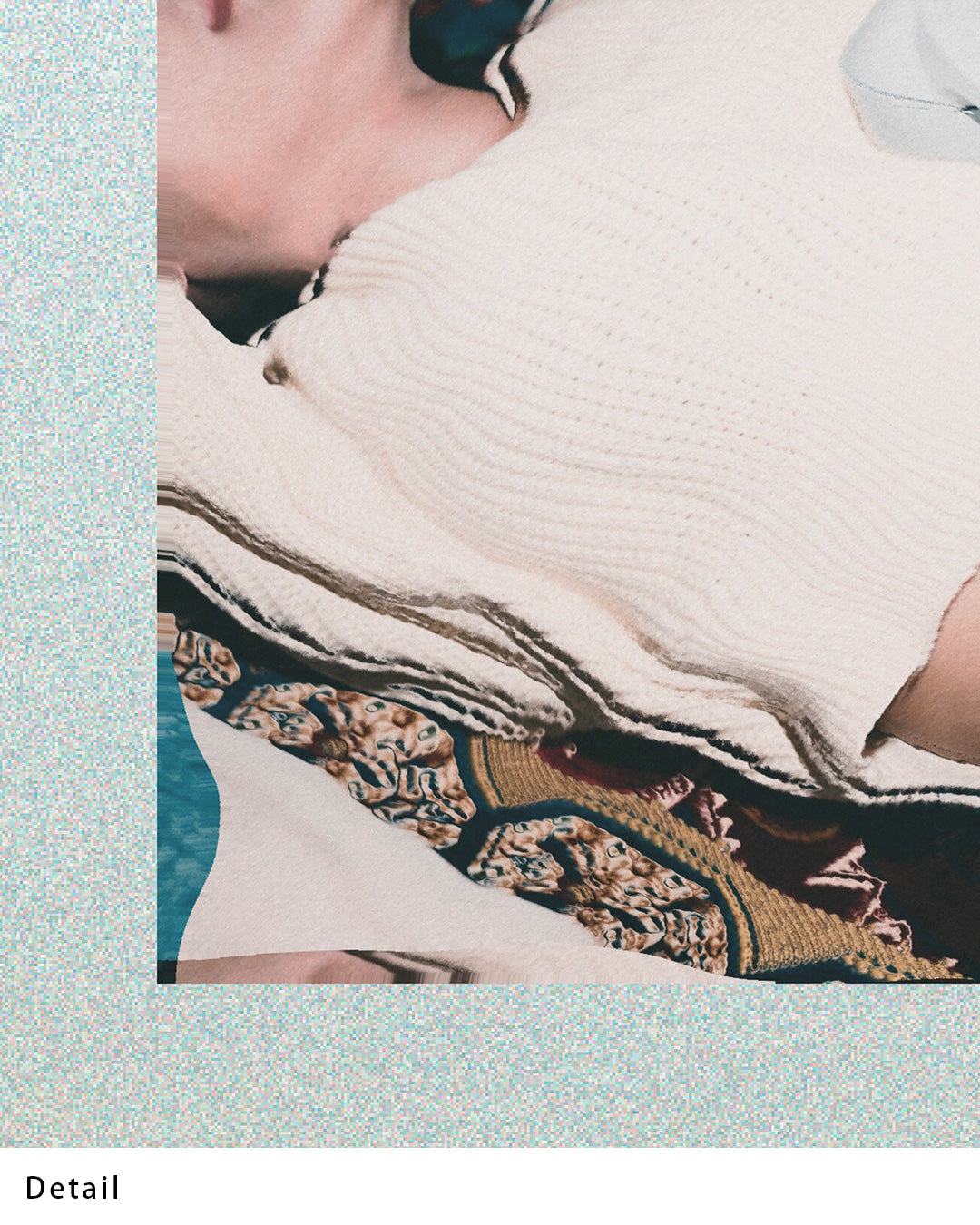 寝そべる人物の輪郭がデジタル的なノイズに侵食され、私たちが認識する「存在」がいかに流動的なものであるかを示唆しています。