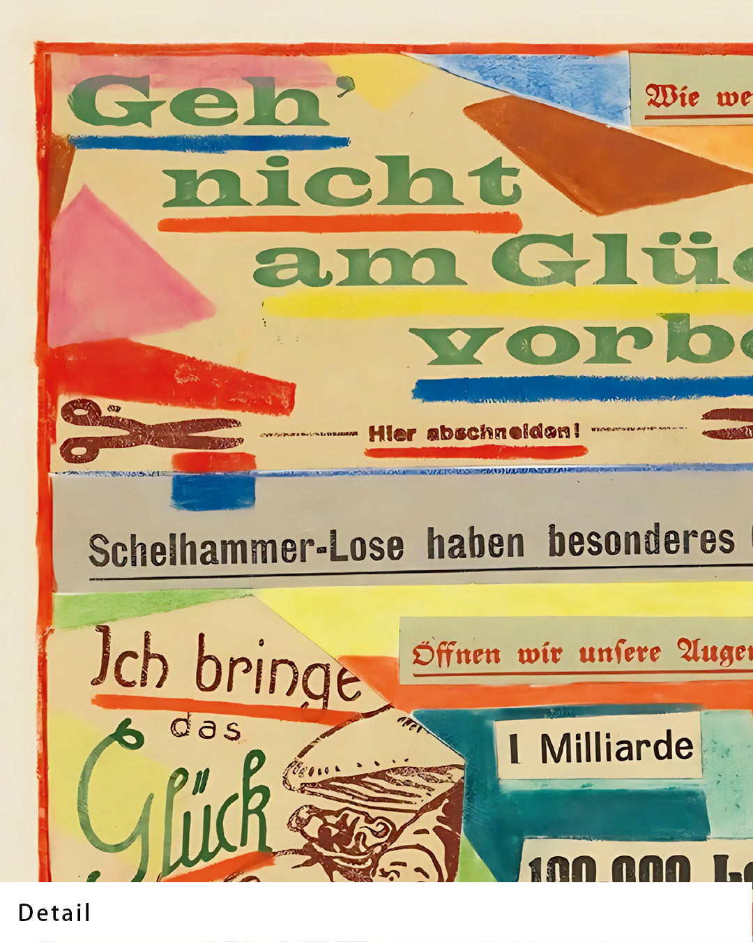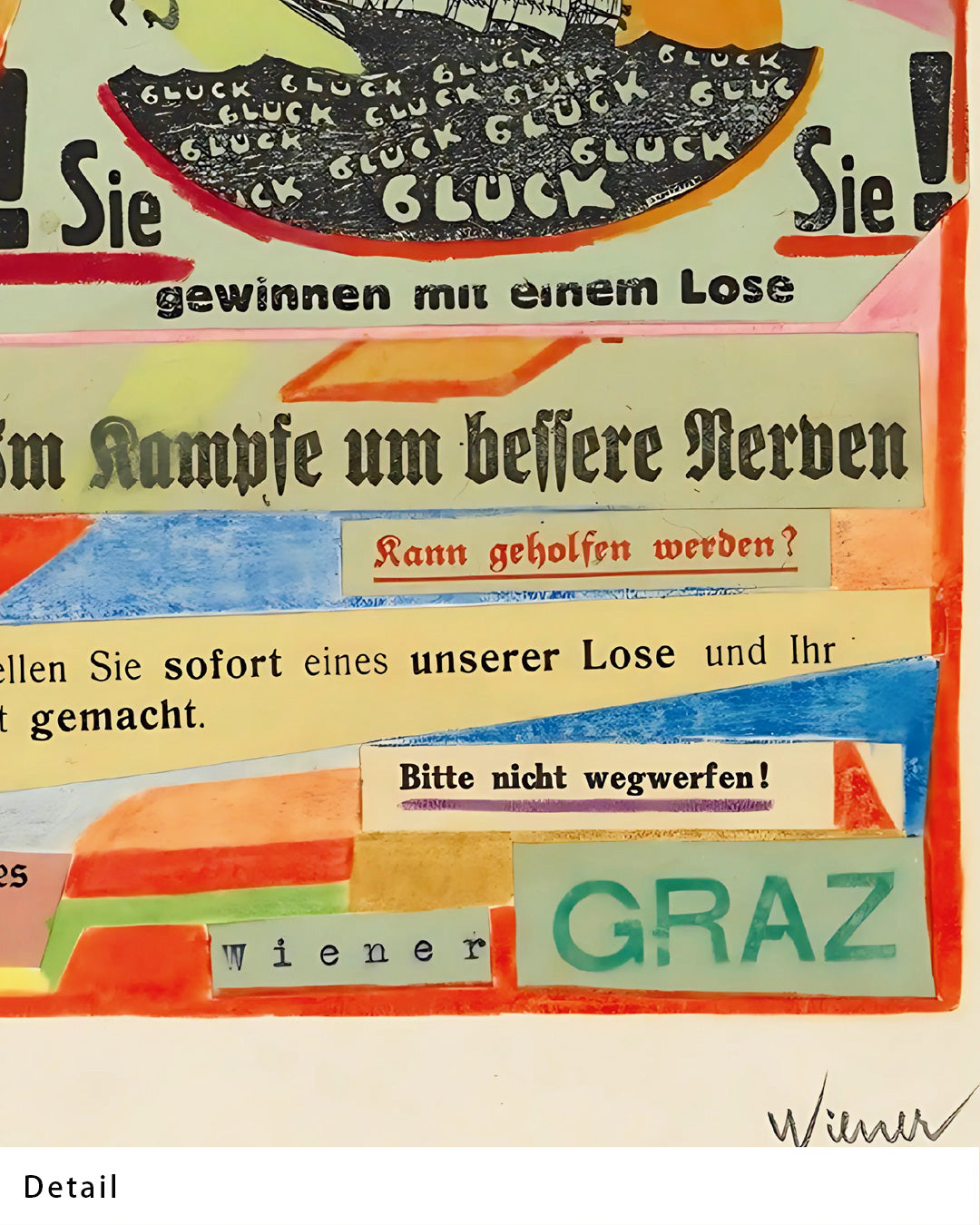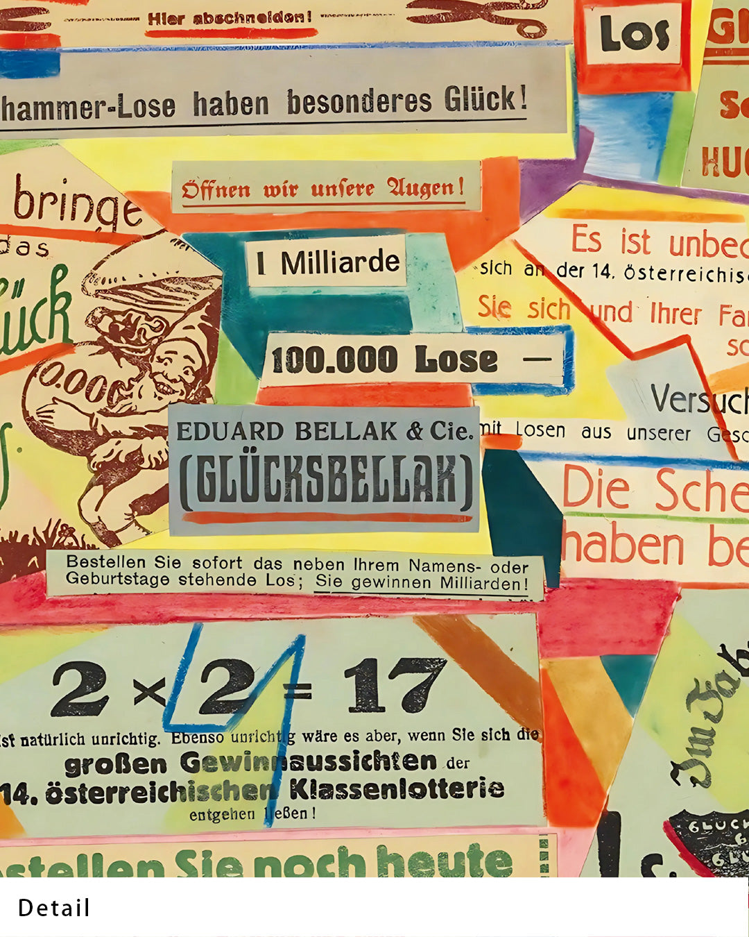 カール・ウィーナーが1929年に制作した《Plakat》は、当時の広告や印刷物をコラージュし、カラフルでダイナミックな構成に仕上げた作品です。ドイツ語で「ポスター」を意味するタイトルの通り、これはまさに商業デザインと芸術が交差する一枚。