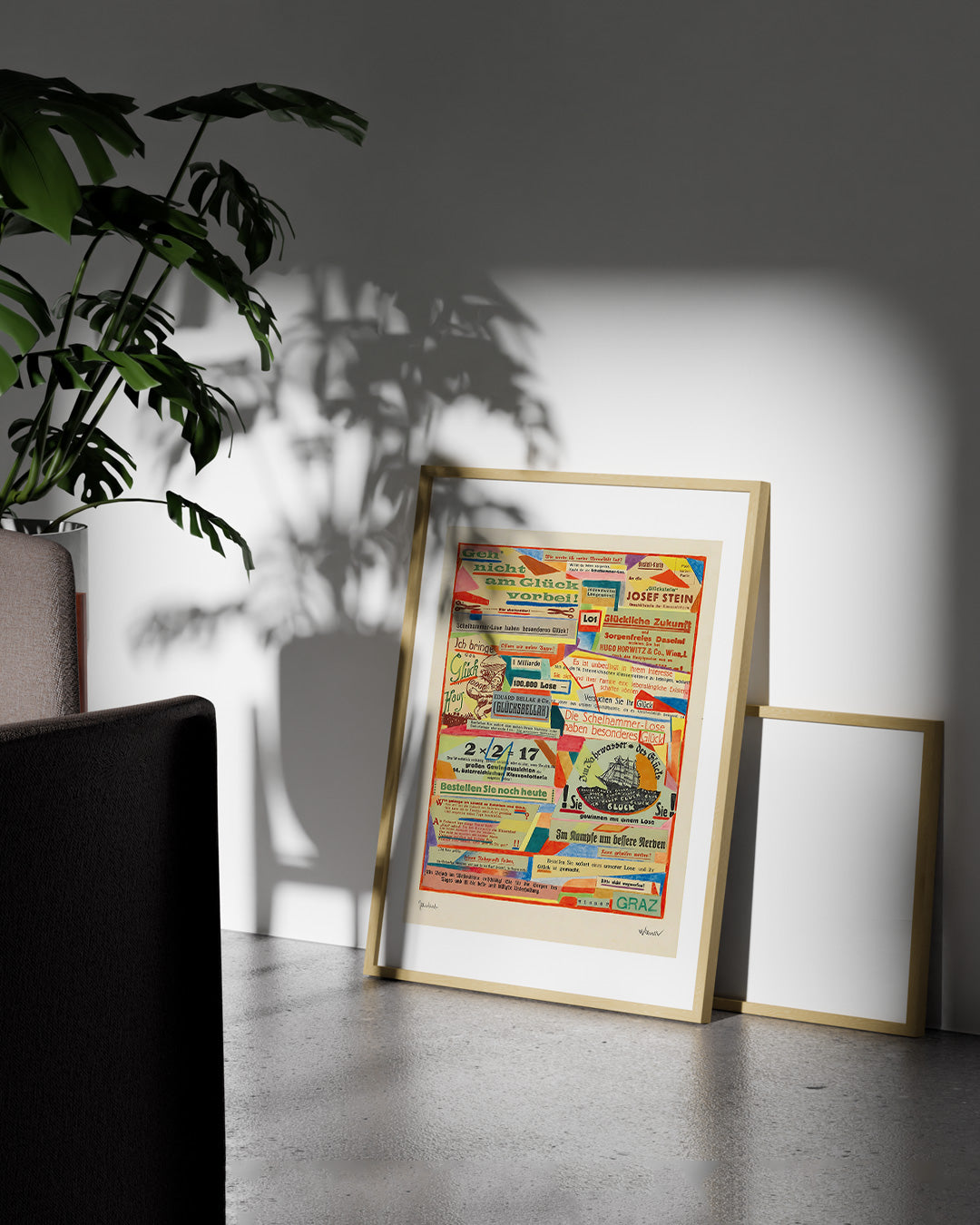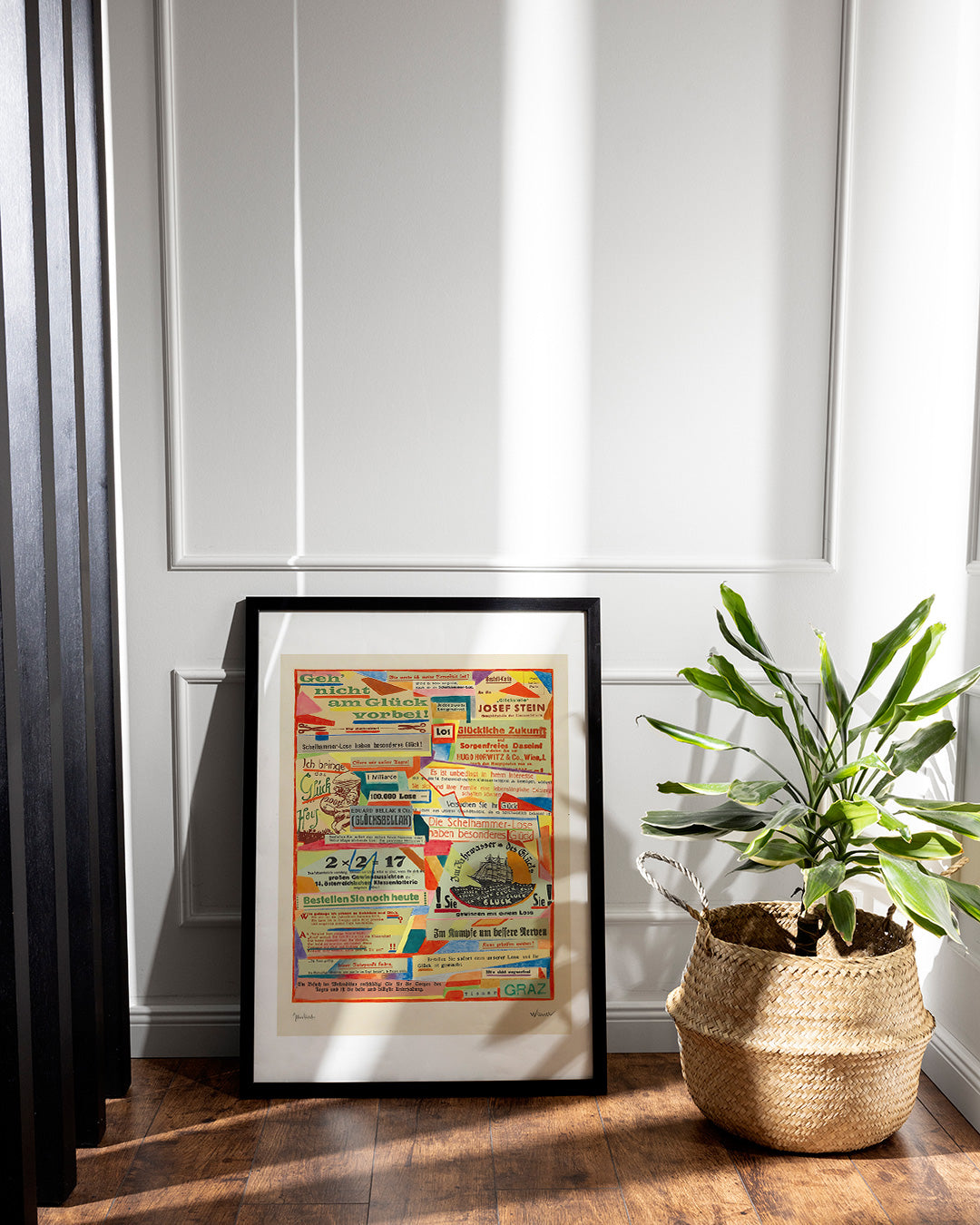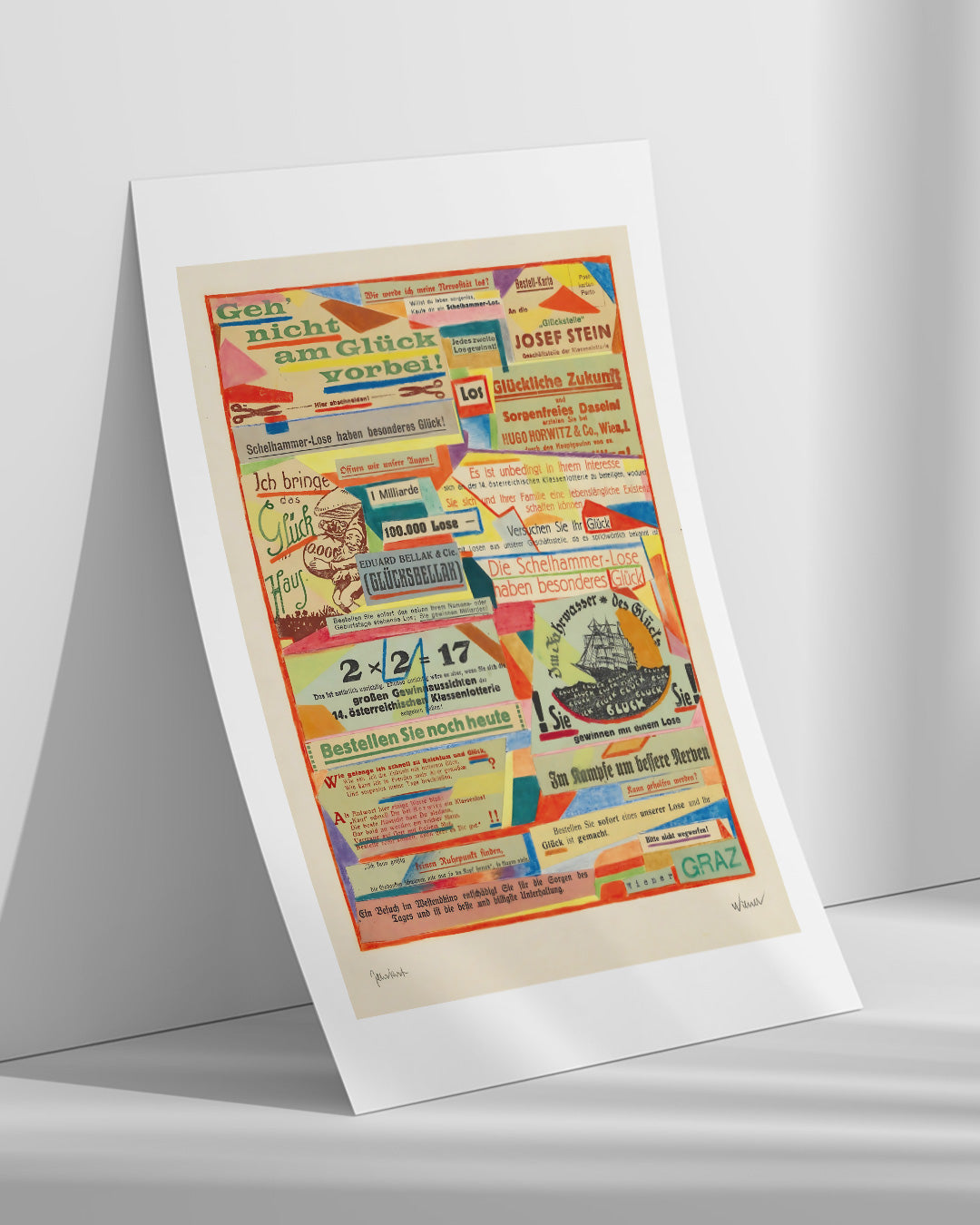 カール・ウィーナーが1929年に制作した《Plakat》は、当時の広告や印刷物をコラージュし、カラフルでダイナミックな構成に仕上げた作品です。ドイツ語で「ポスター」を意味するタイトルの通り、これはまさに商業デザインと芸術が交差する一枚。
