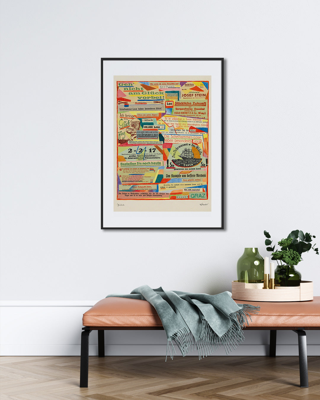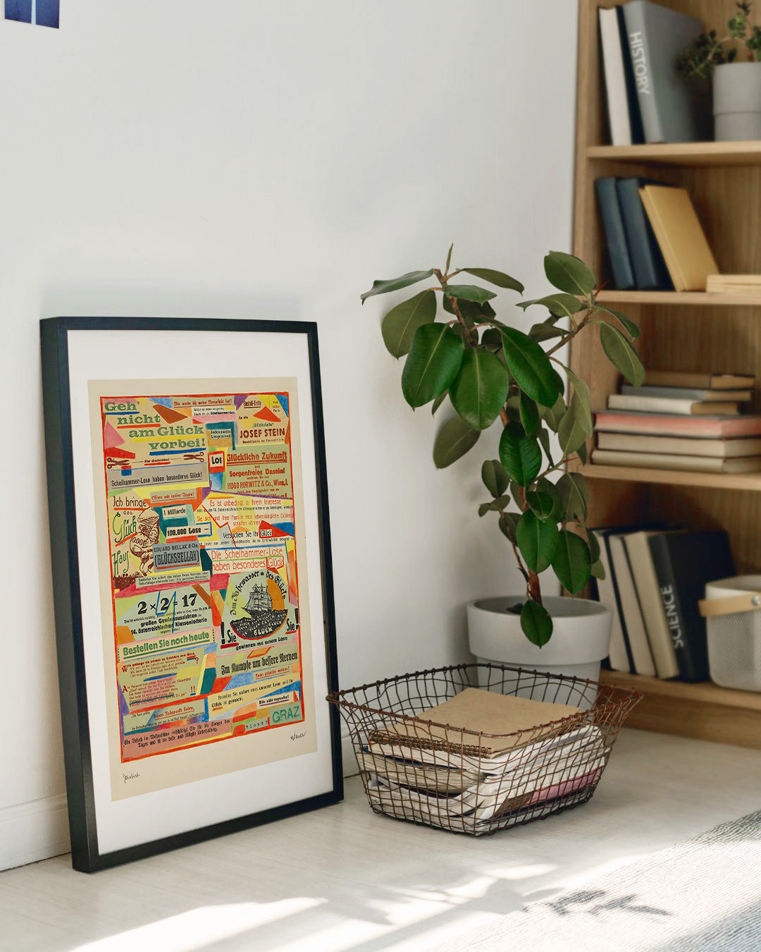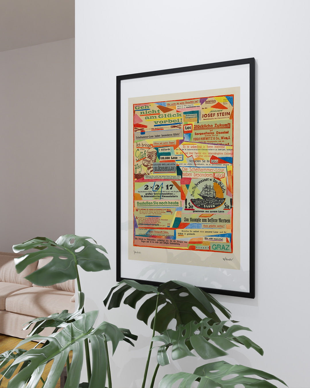 幸運の断片をコラージュした、鮮やかなポスターアート