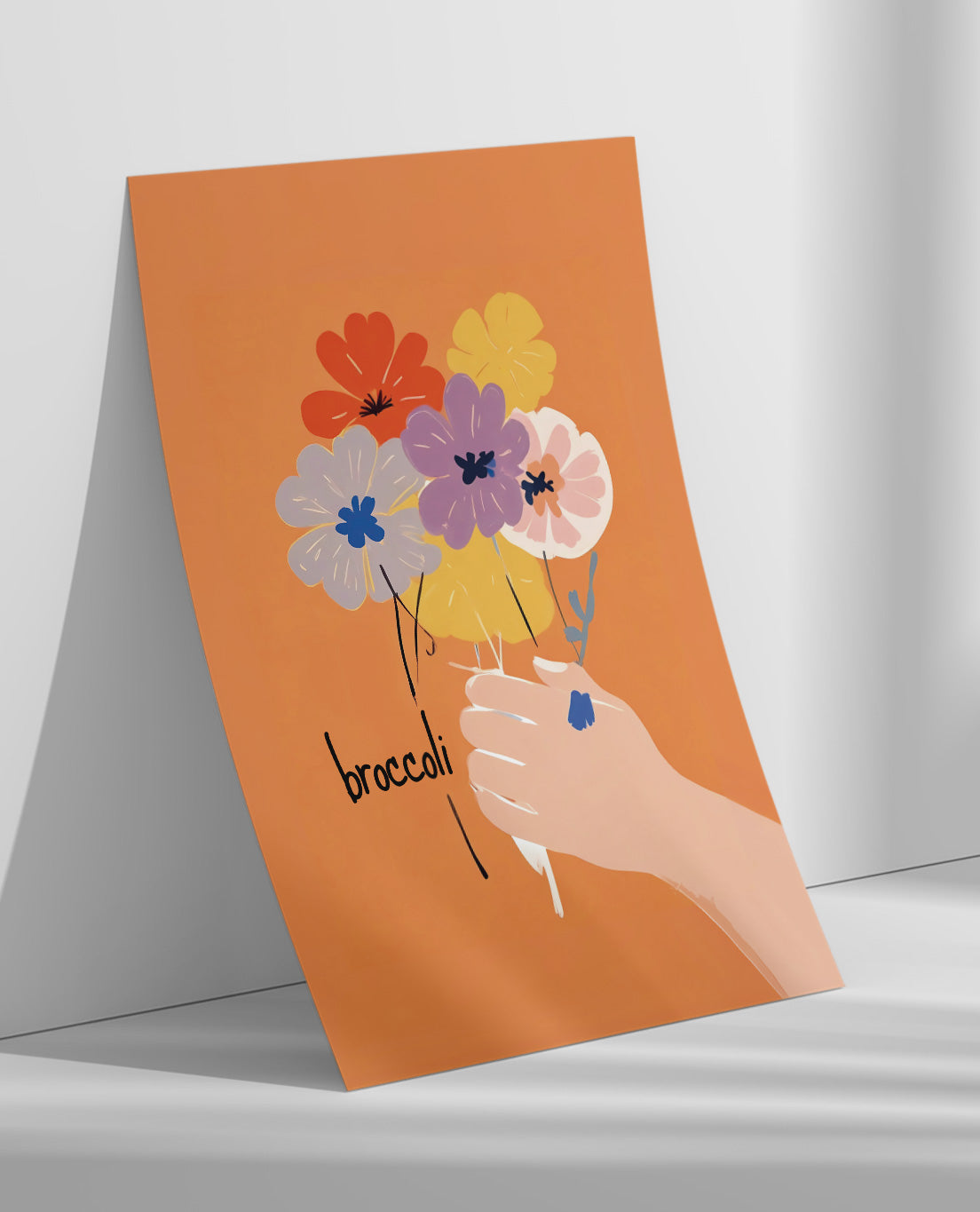 ぱっと目を惹くビビッドなオレンジの背景に、柔らかなタッチで描かれたブーケ。ユーモアたっぷりの「broccoli」のロゴと、指輪をつけた手が花束を差し出すシーンがどこか心くすぐります。