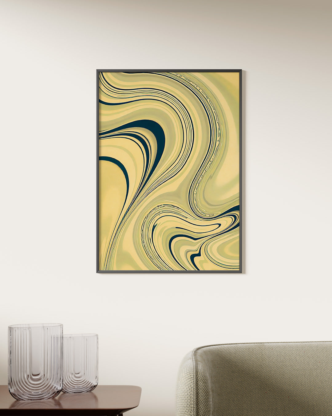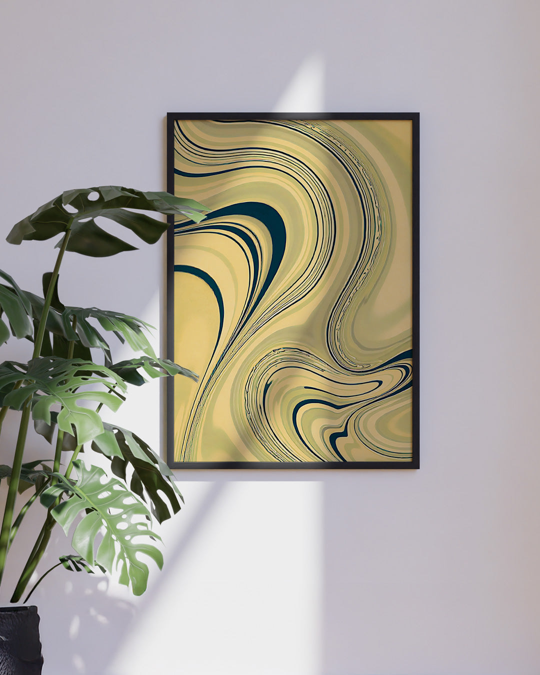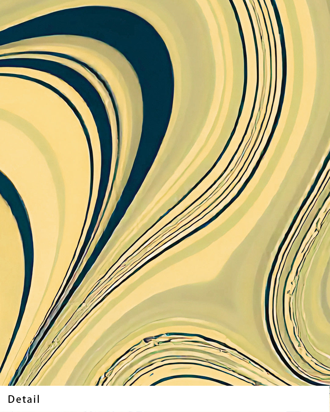 柔らかなゴールドを基調に、深いネイビーのラインが優雅なカーブを描くアブストラクトアート。