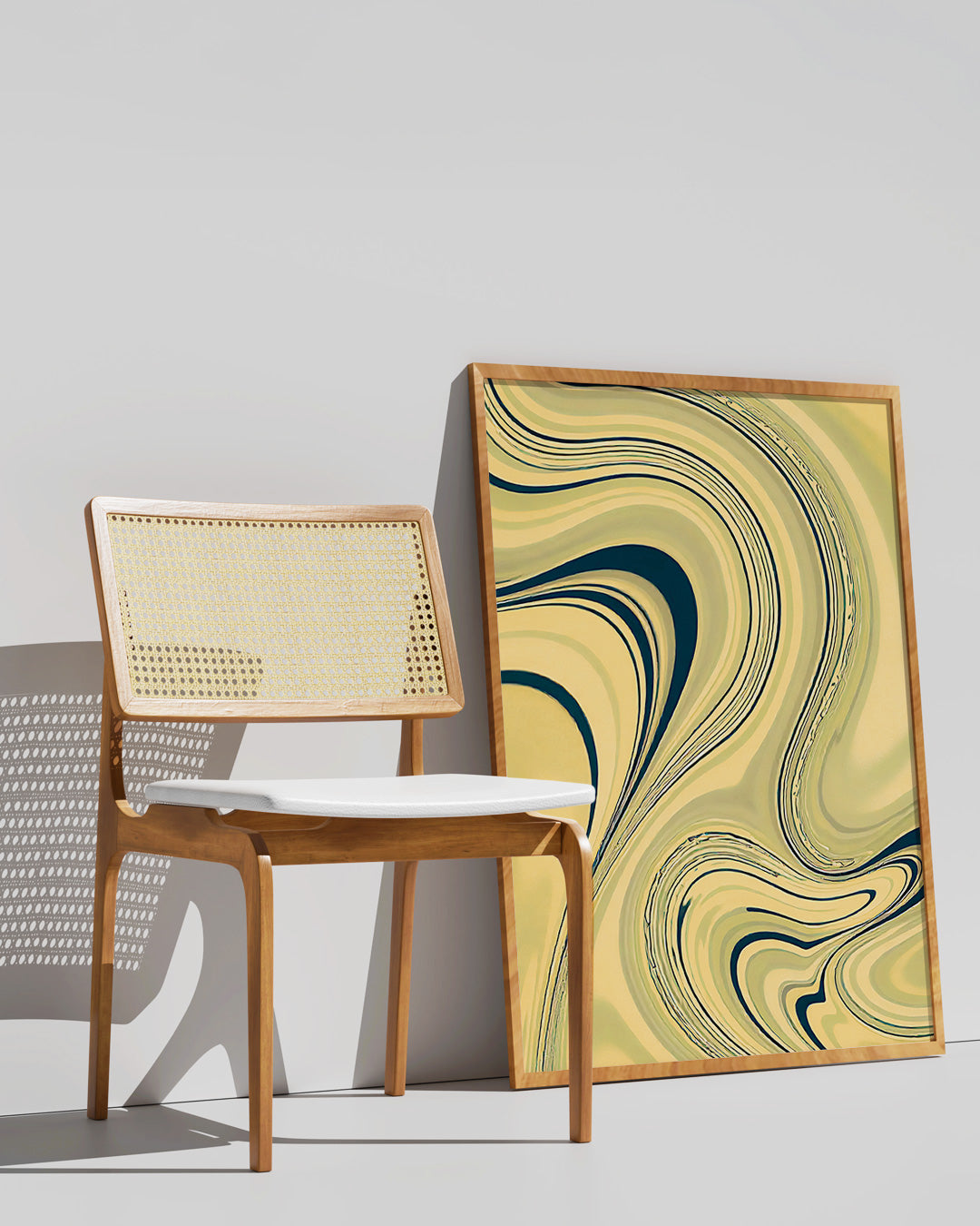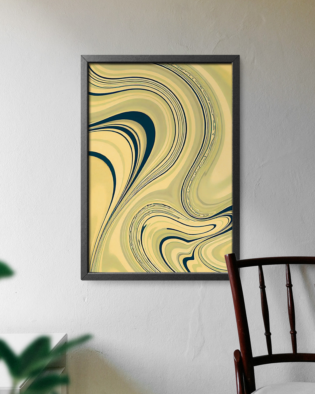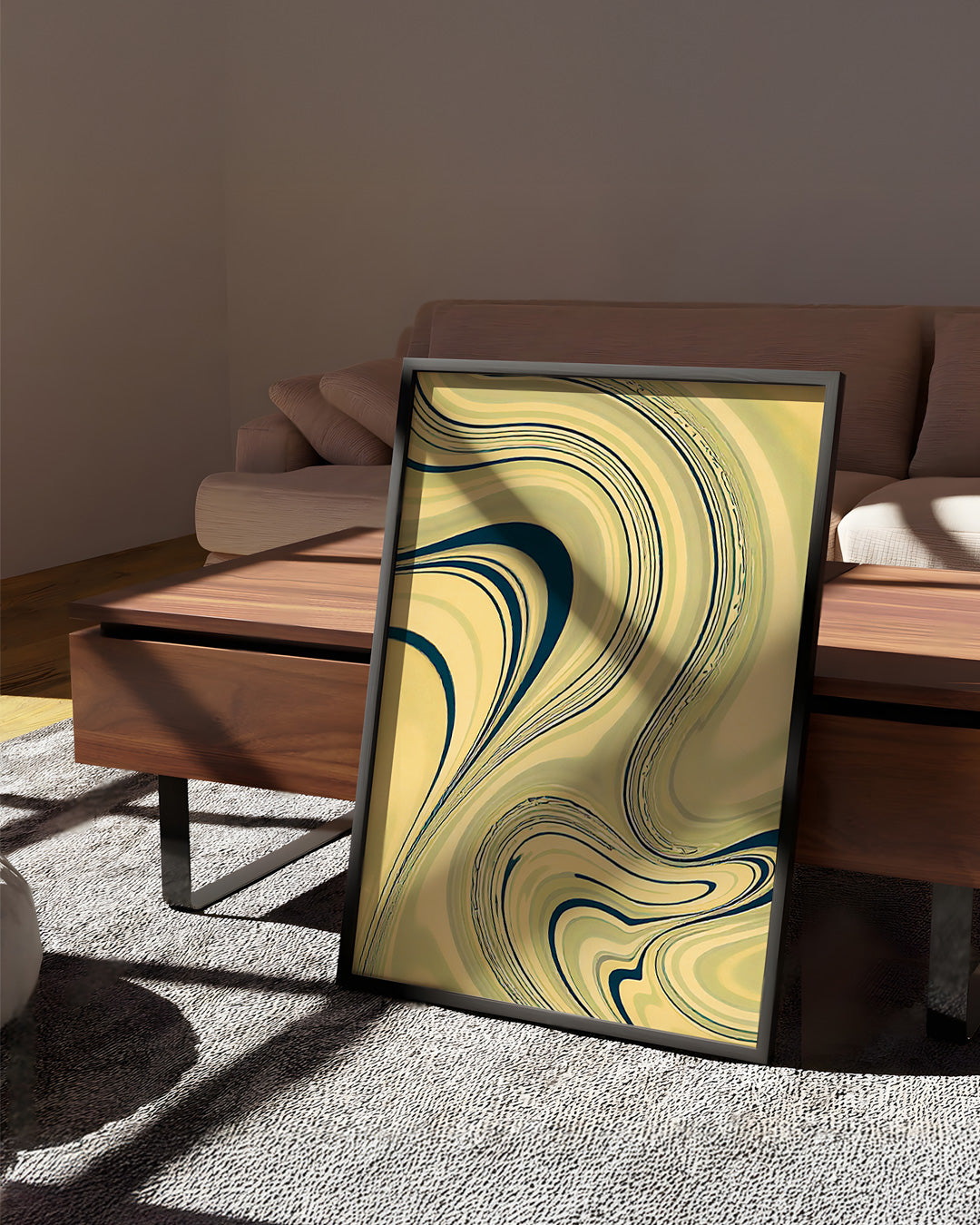 柔らかなゴールドを基調に、深いネイビーのラインが優雅なカーブを描くアブストラクトアート。