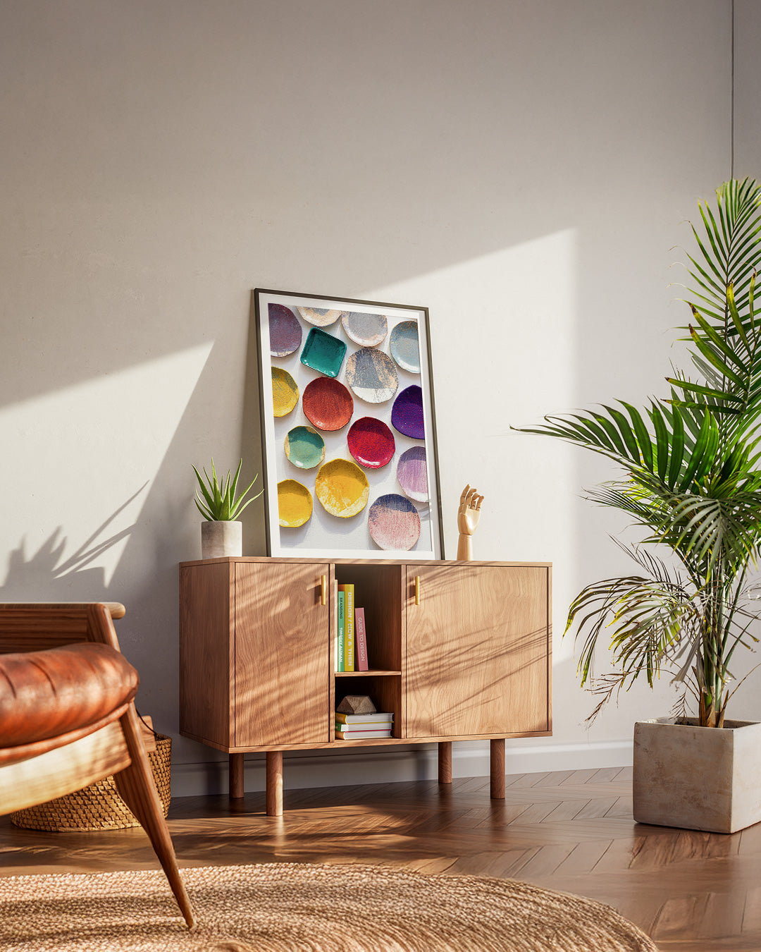 まるでカラフルな陶器皿を並べたような、ユニークでポップな印象のアートポスター。