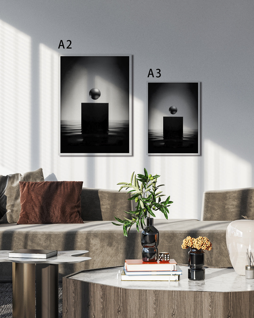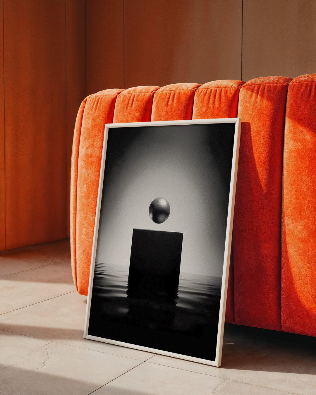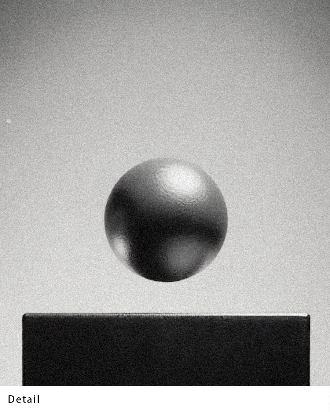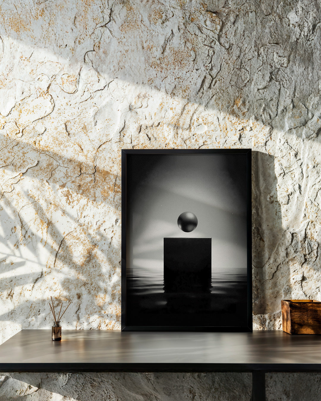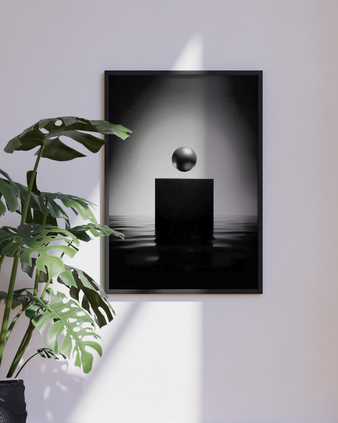 モノクロームの静けさの中に、浮かび上がる球体と直方体が描くポスター作品「Equilibrium in Silence」。