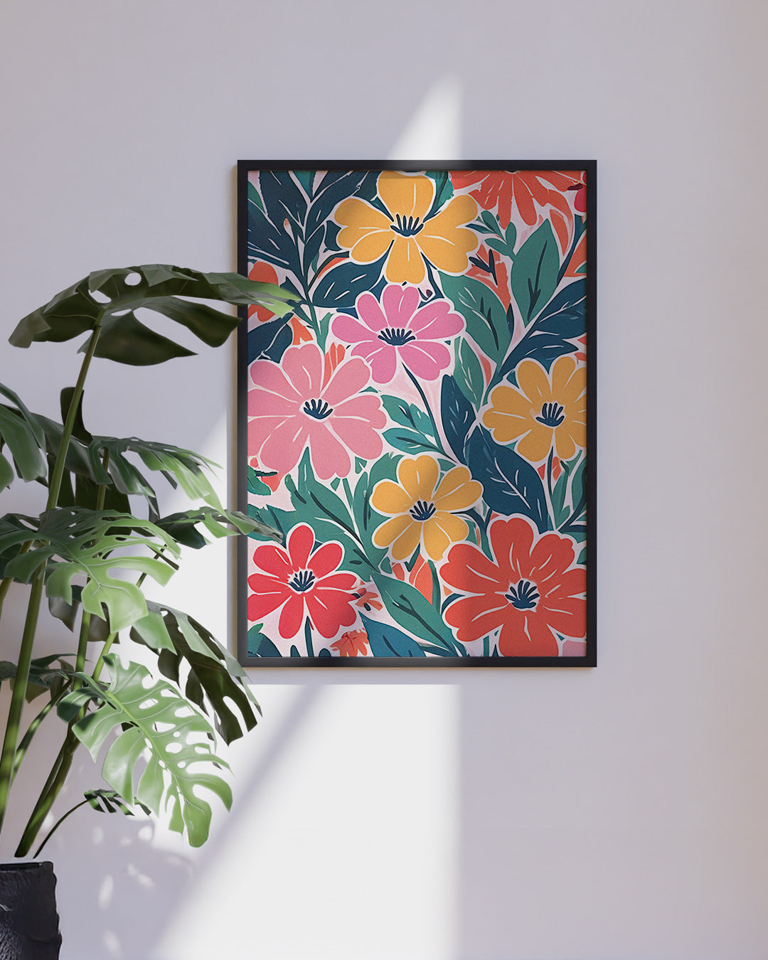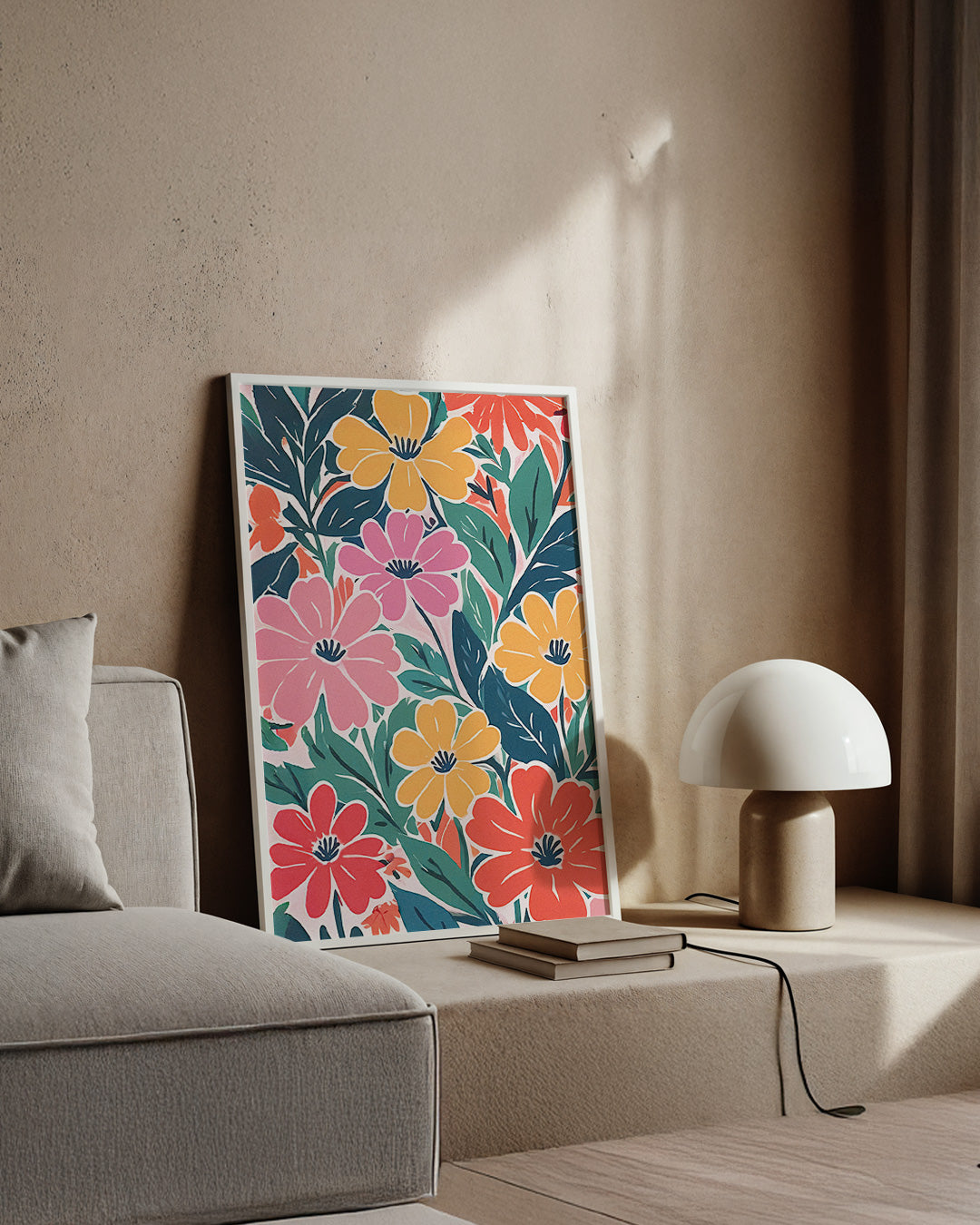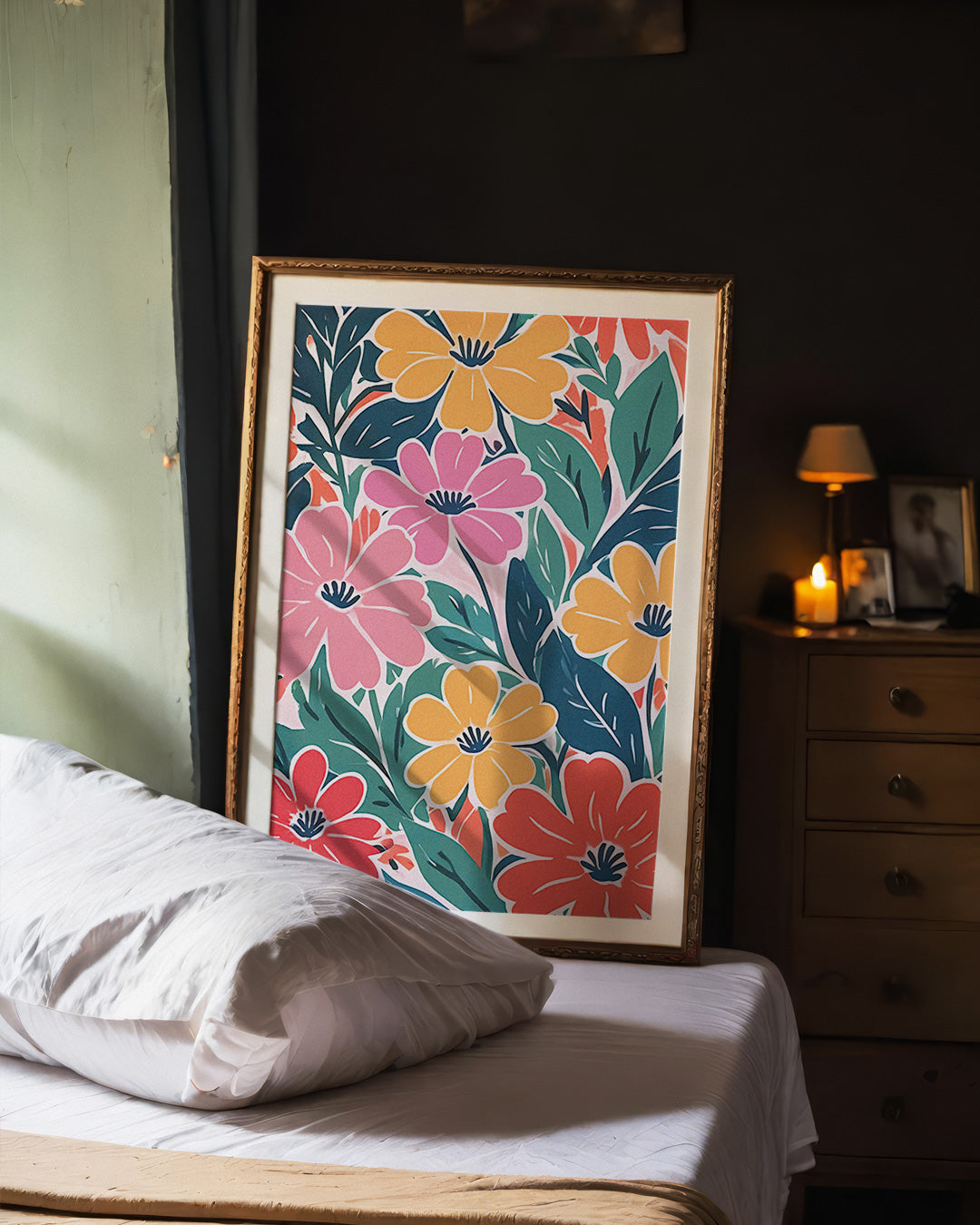 色とりどりの花々が咲き誇るフラワーモチーフのアートポスター。