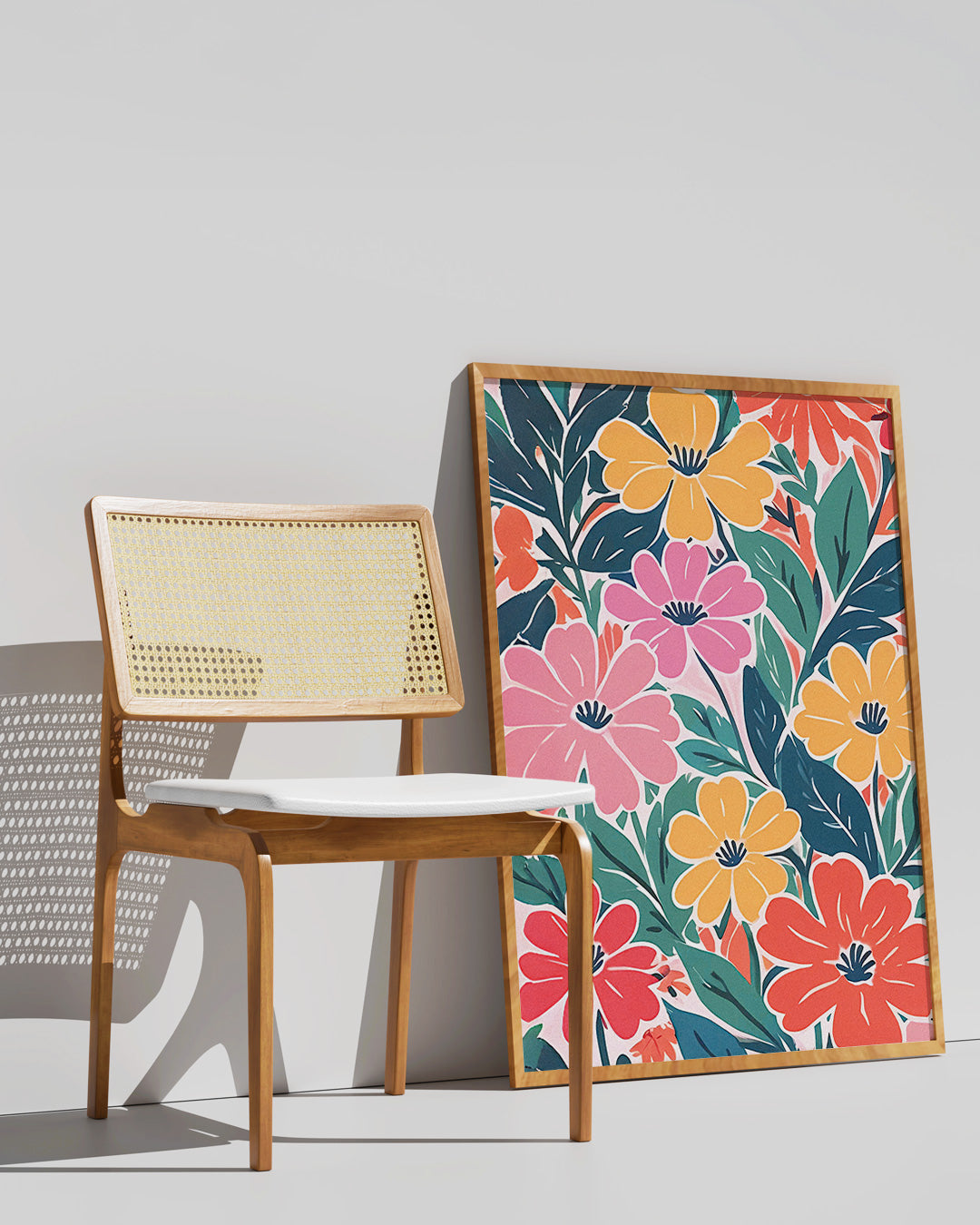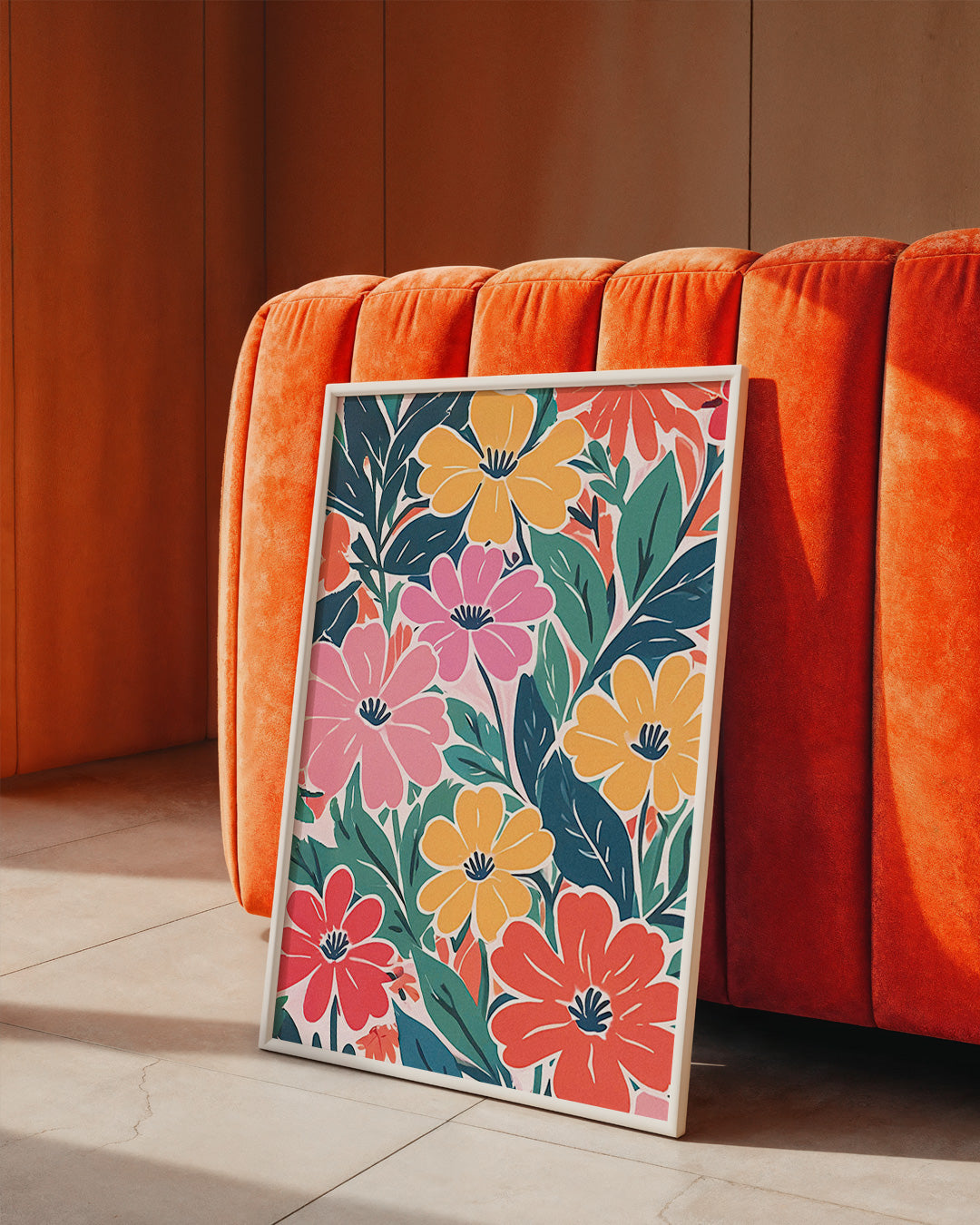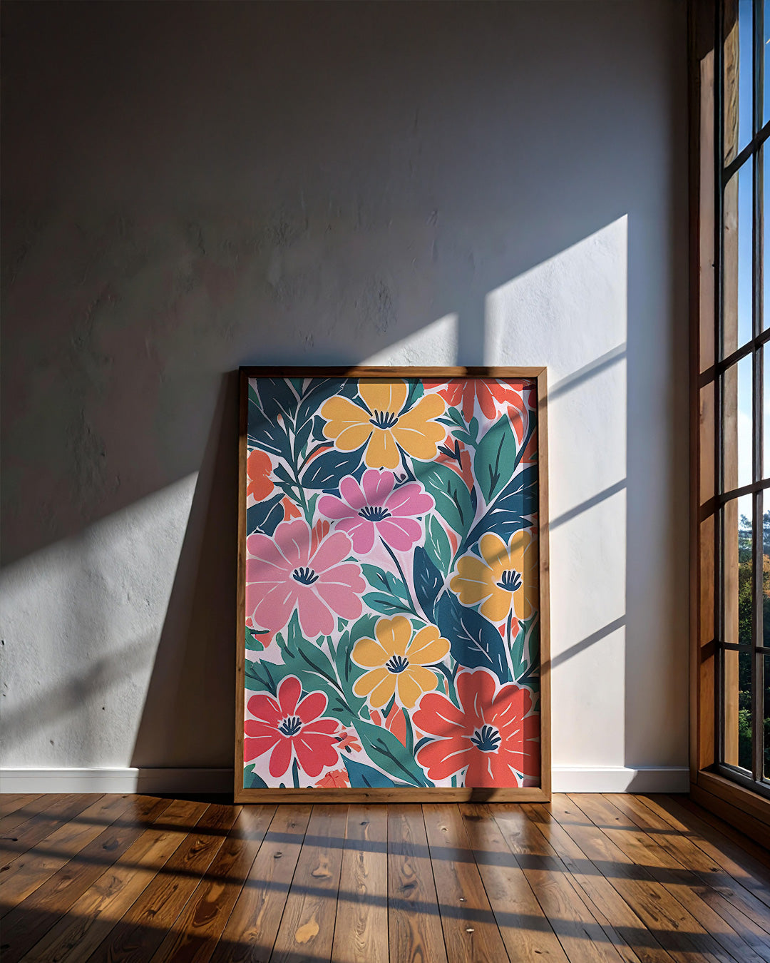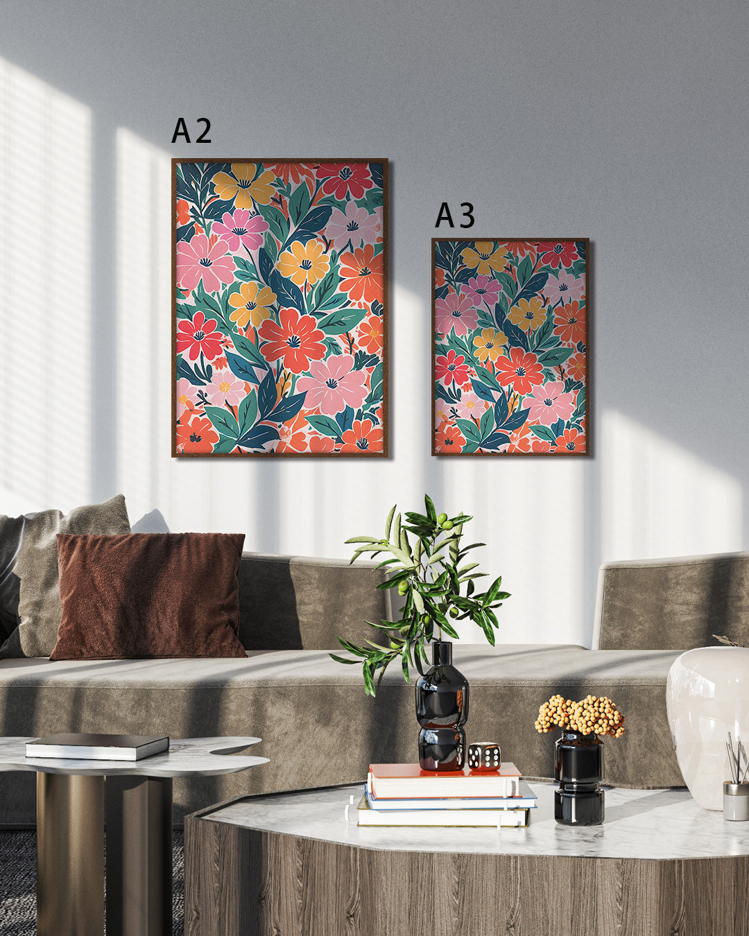 色とりどりの花々が咲き誇るフラワーモチーフのアートポスター。