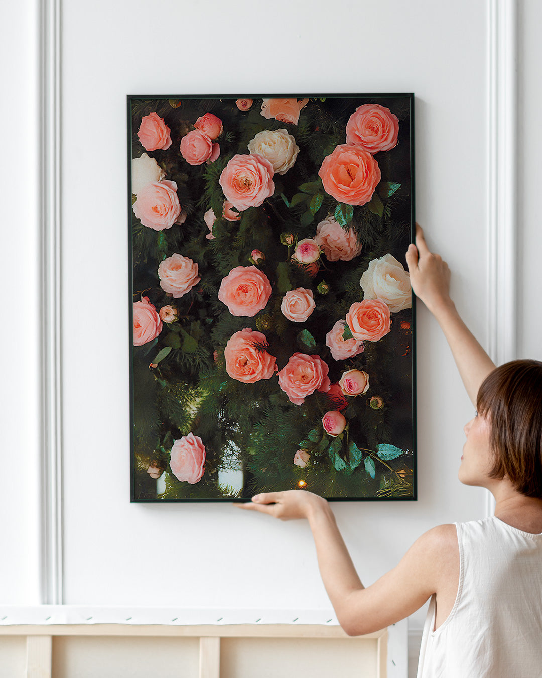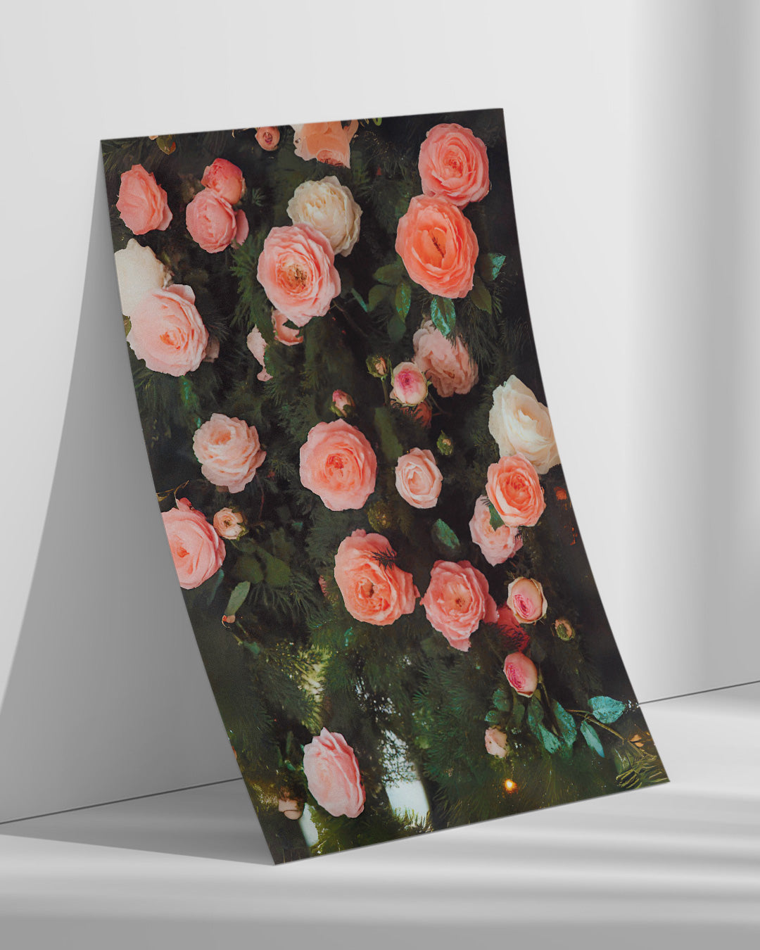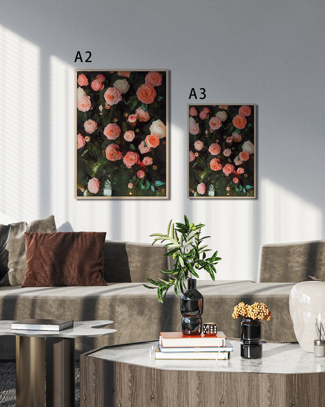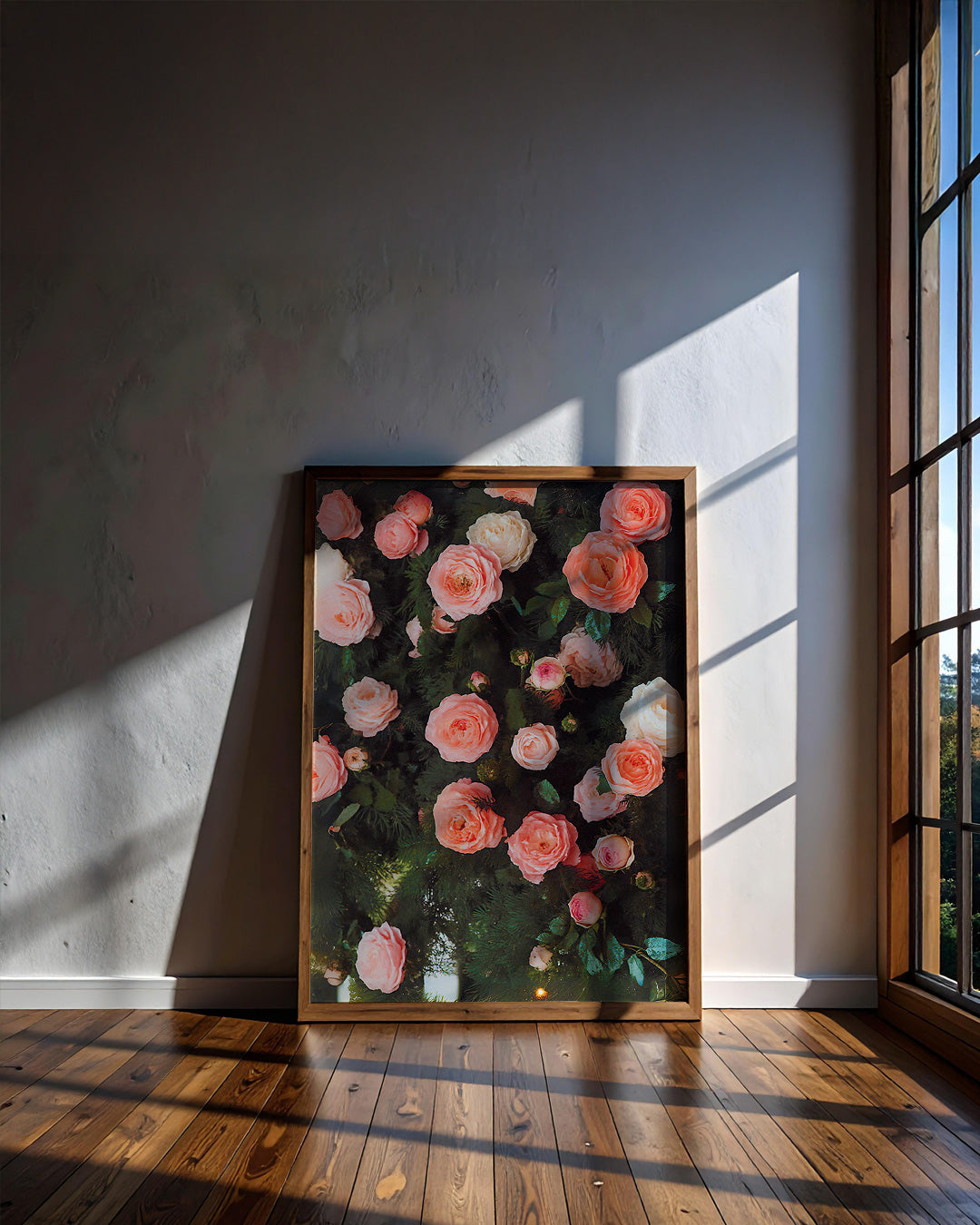 やわらかなピンクとコーラルのバラが咲き誇る、華やかでエレガントなフラワーフォトポスター。