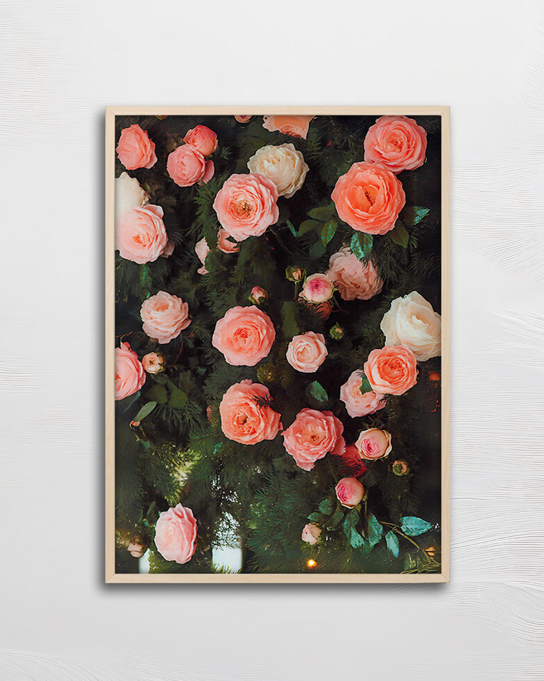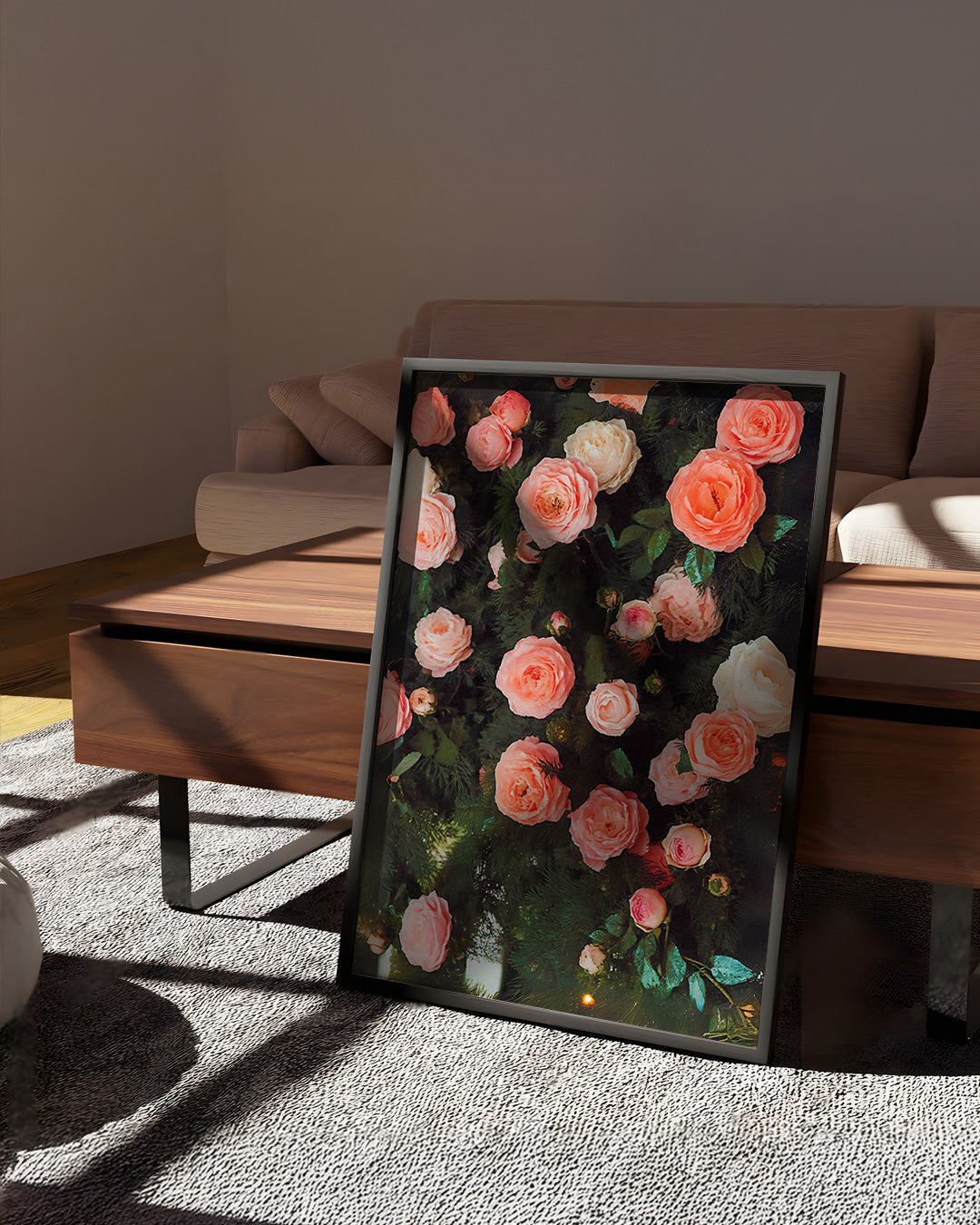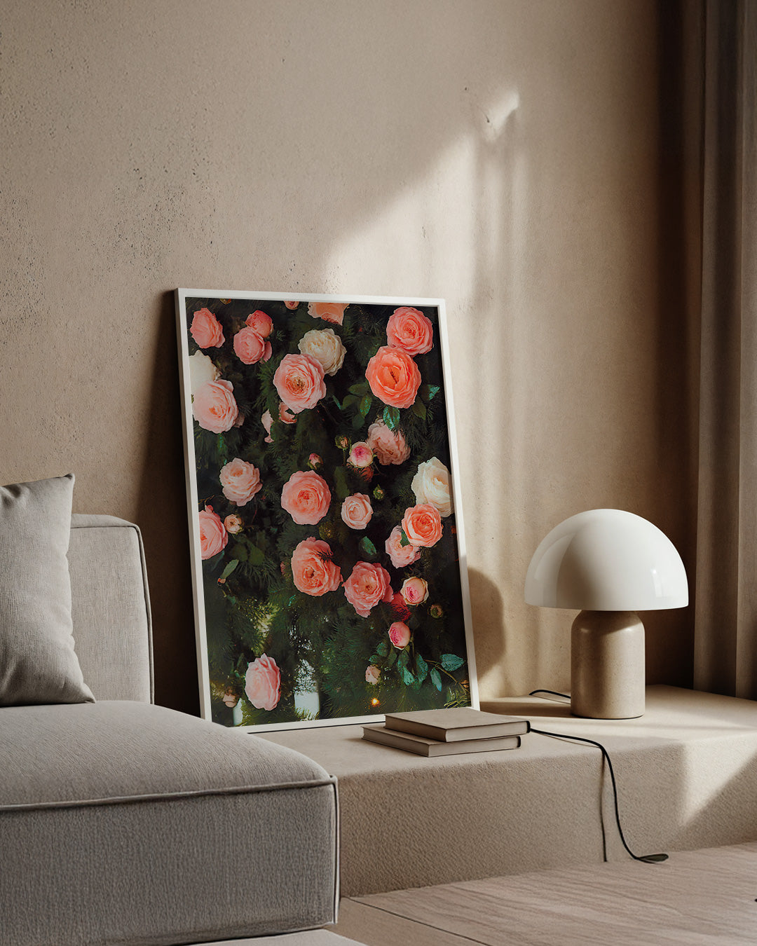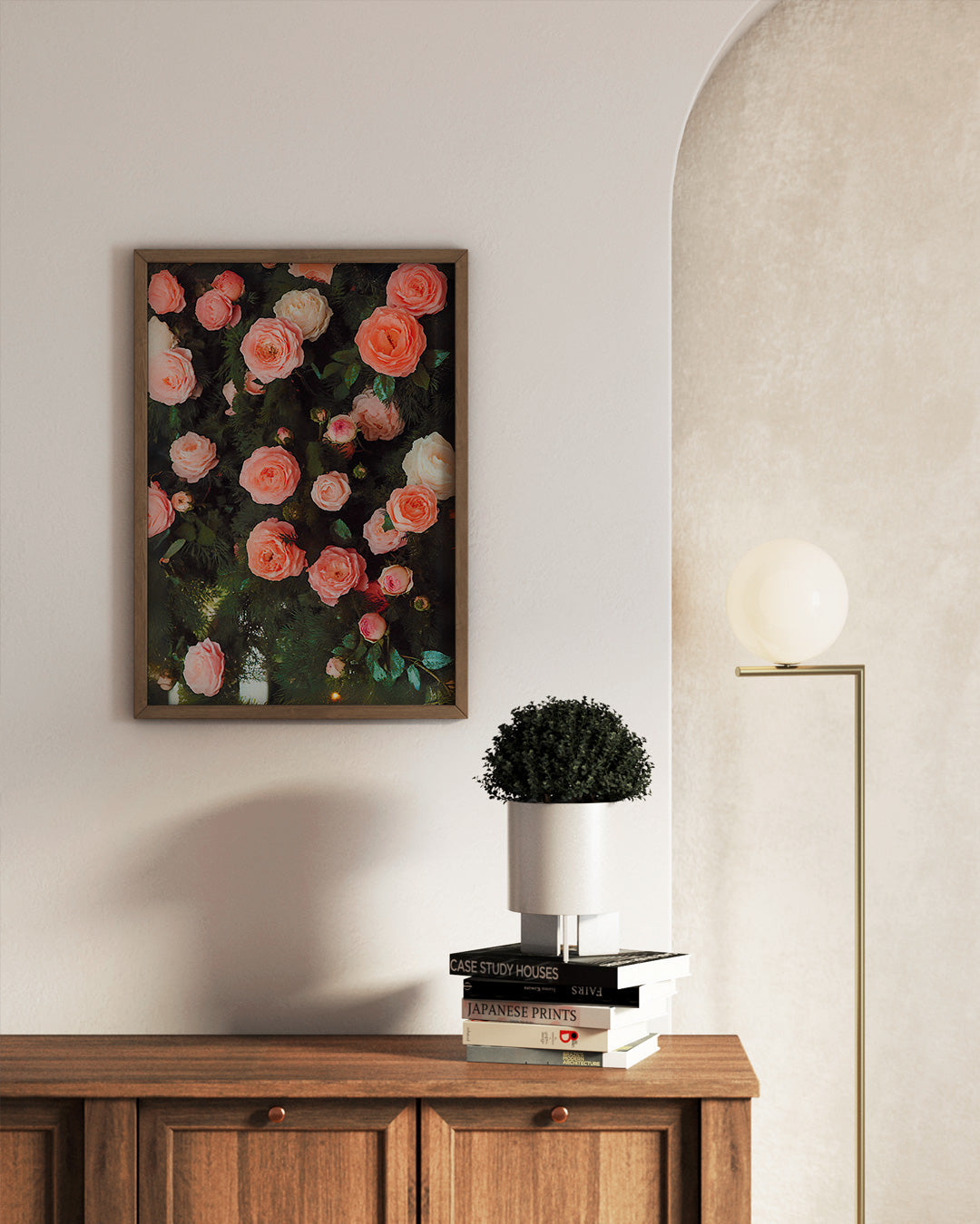 やわらかなピンクとコーラルのバラが咲き誇る、華やかでエレガントなフラワーフォトポスター。