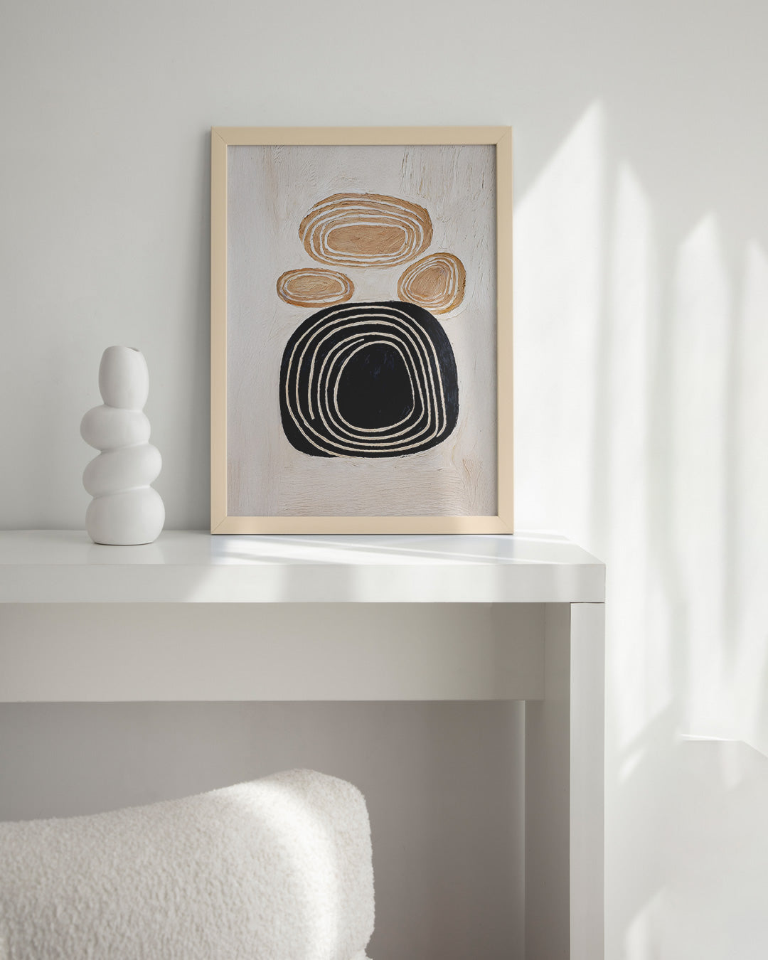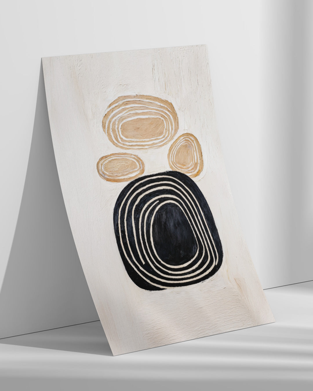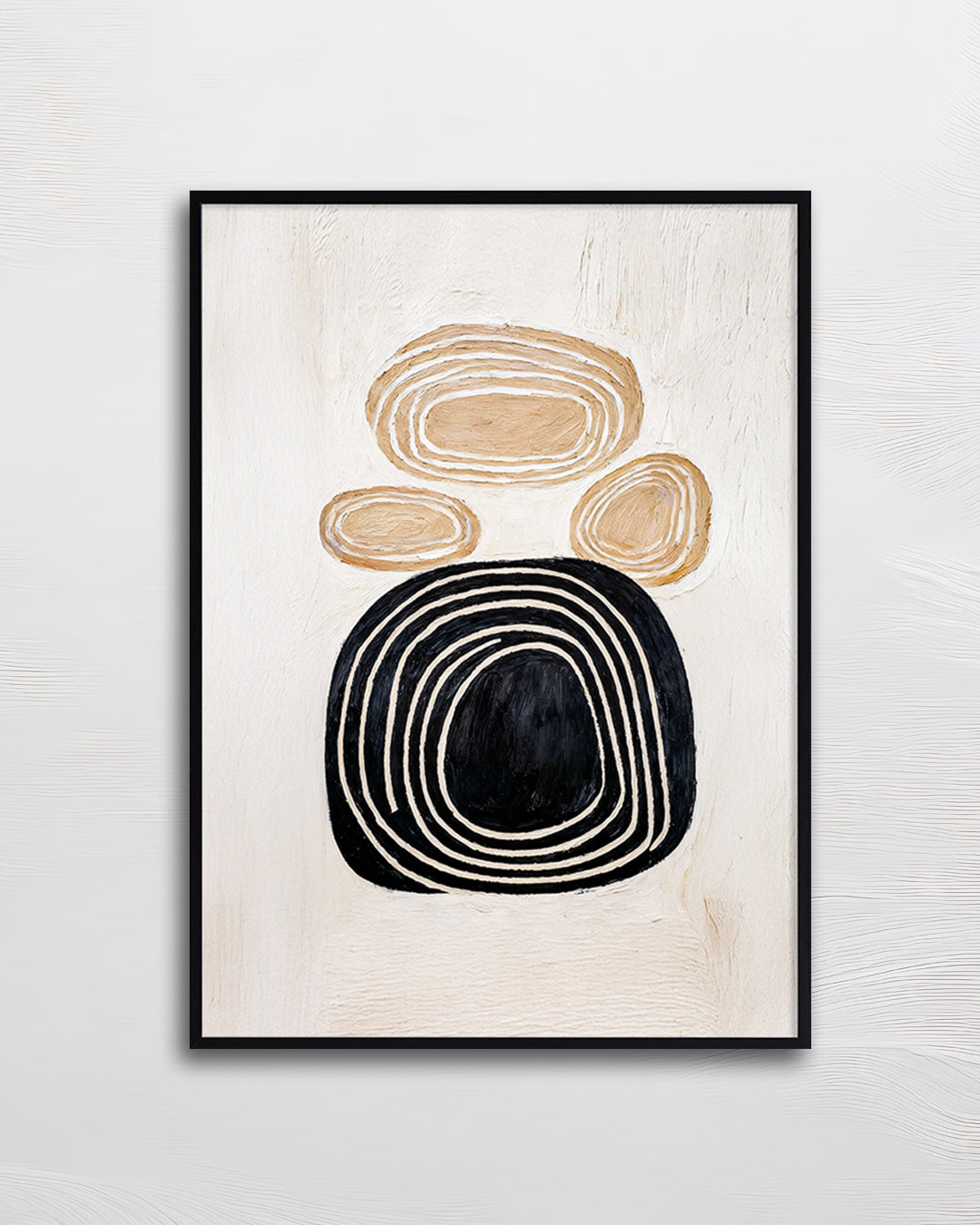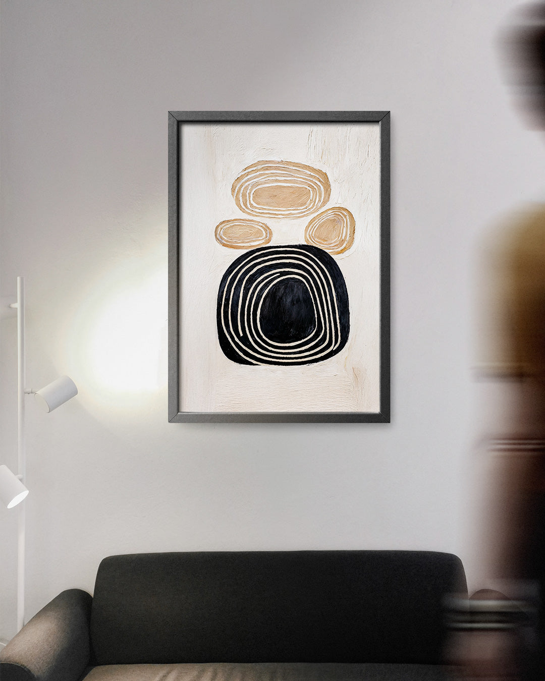 抽象画ポスター《Layered Silence》は、ナチュラルなベージュと深いブラックのコントラストが印象的なモダンアート作品。