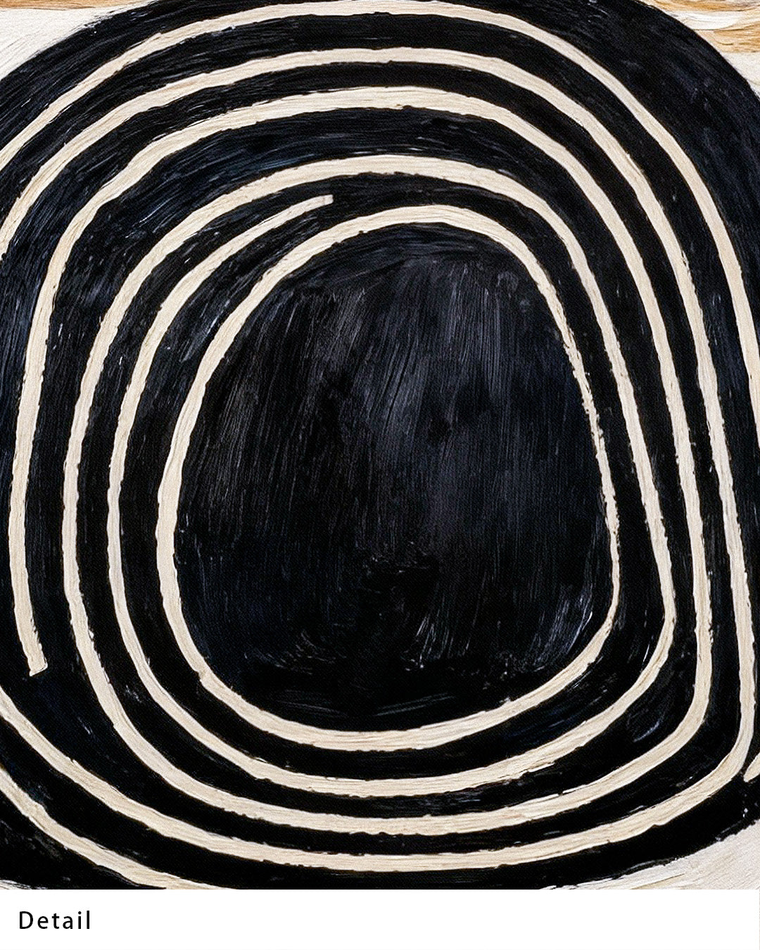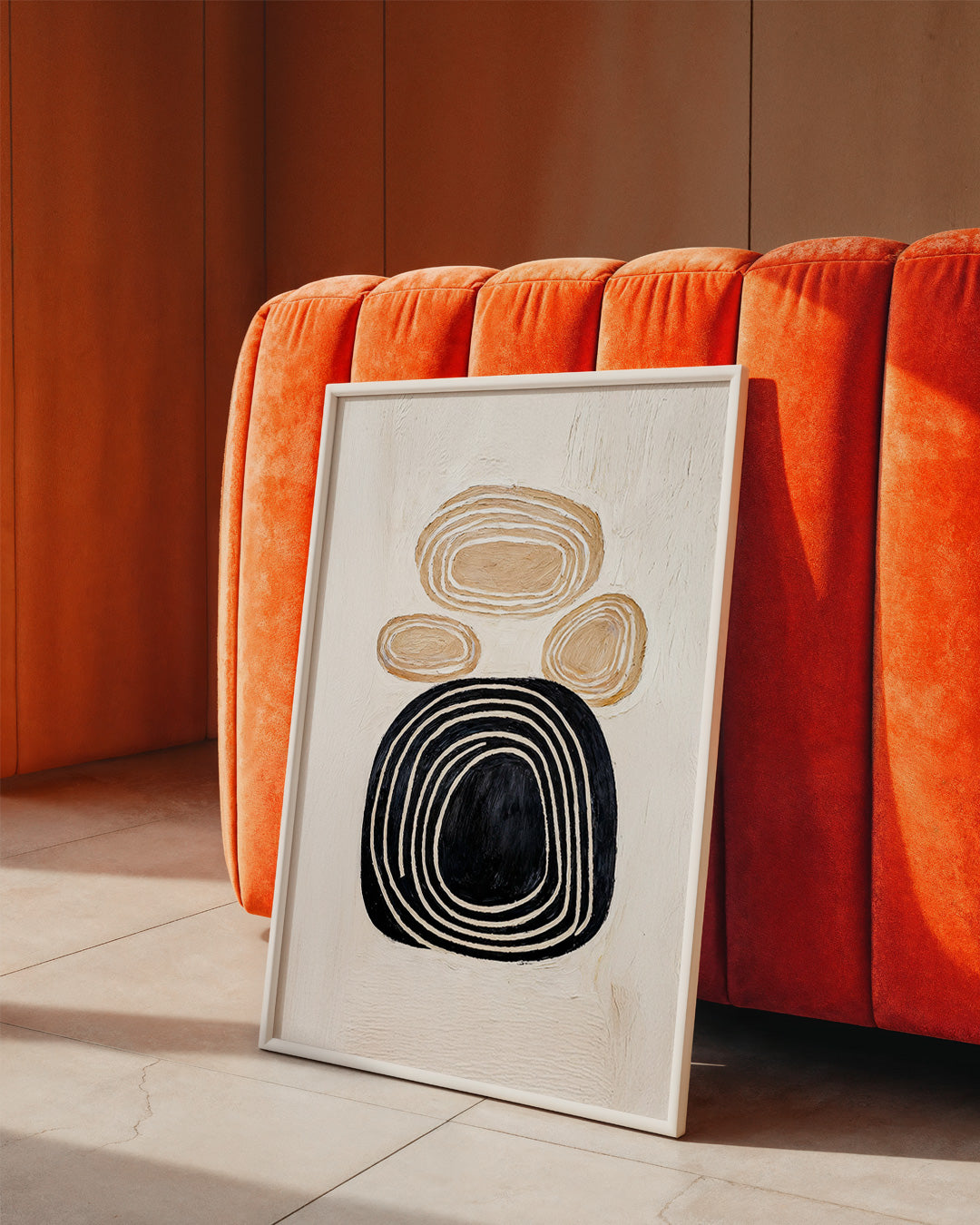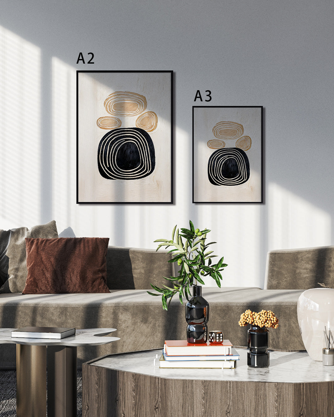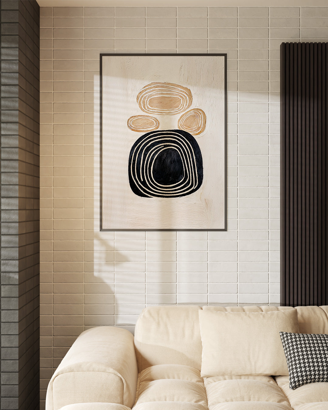 抽象画ポスター《Layered Silence》は、ナチュラルなベージュと深いブラックのコントラストが印象的なモダンアート作品。