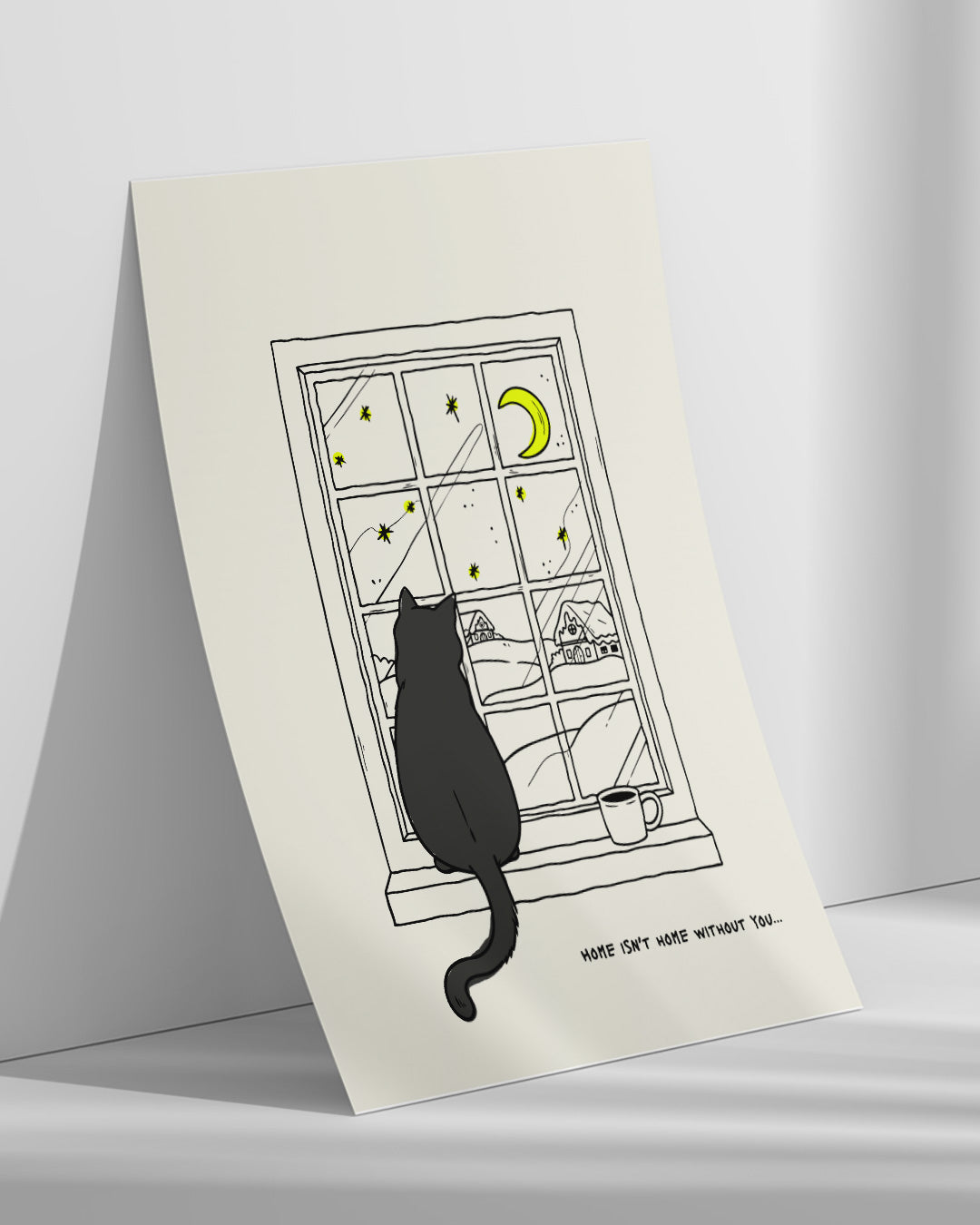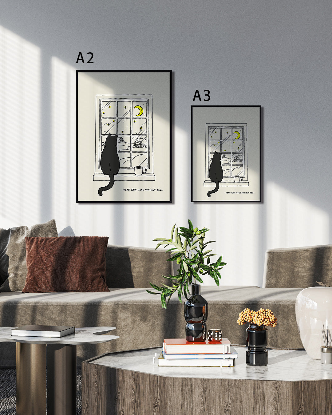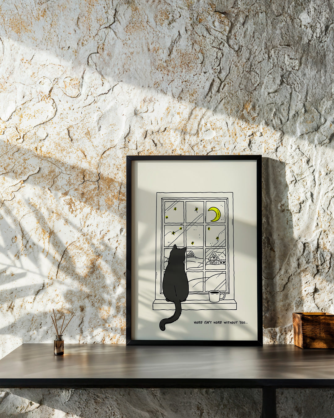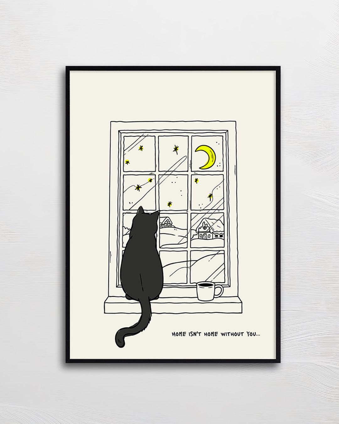 窓辺に座り、夜空を見つめながら飼い主の帰りを待つ黒猫を描いた、ミニマルで温かみのあるアートポスター。