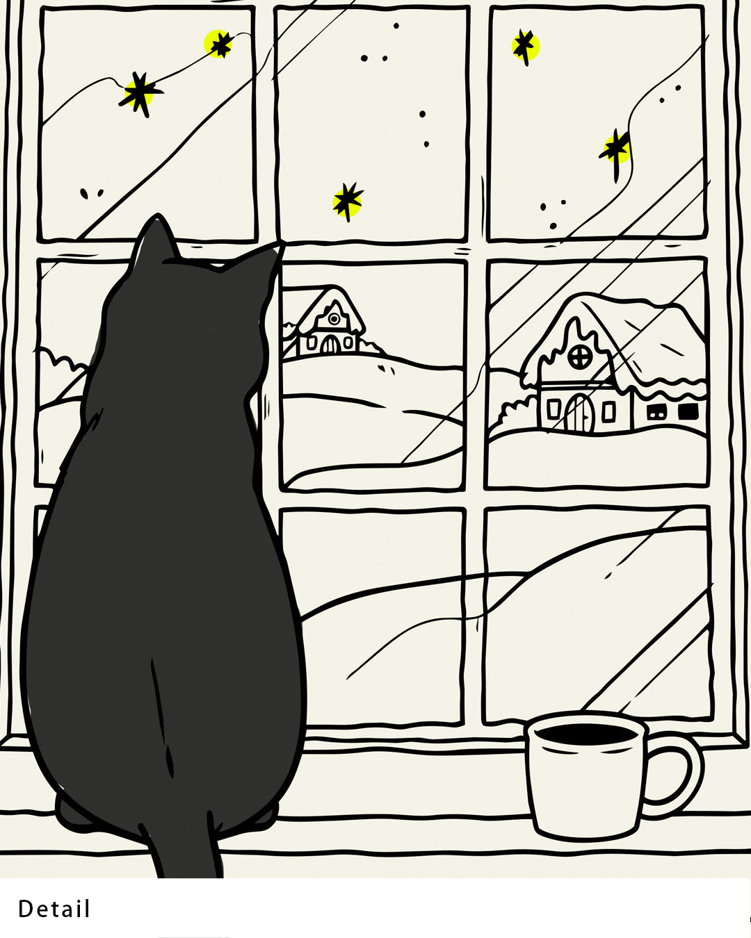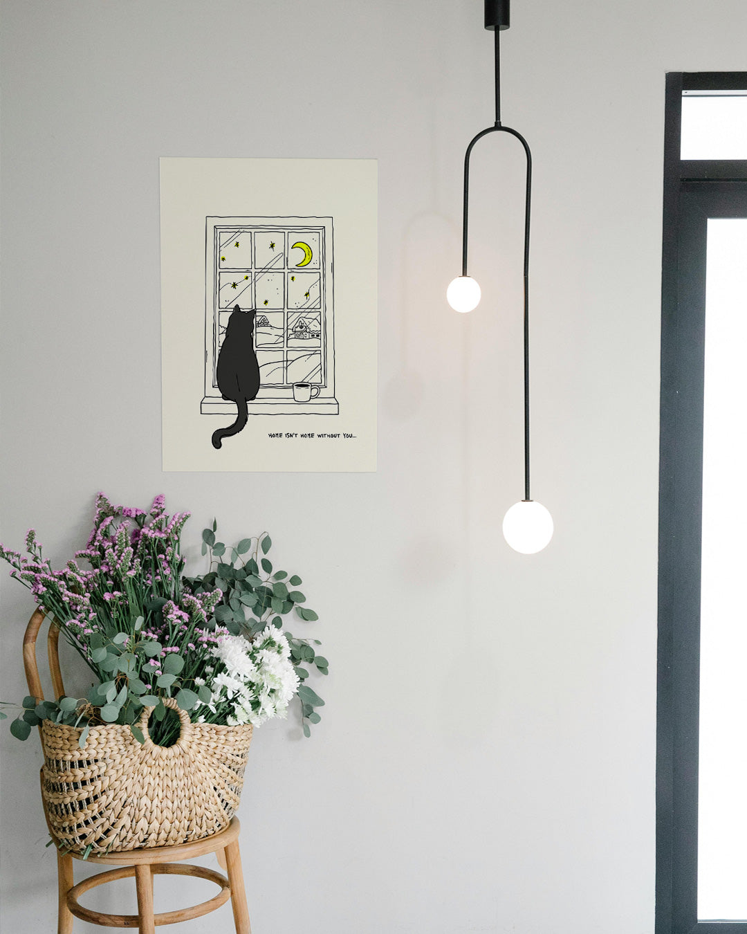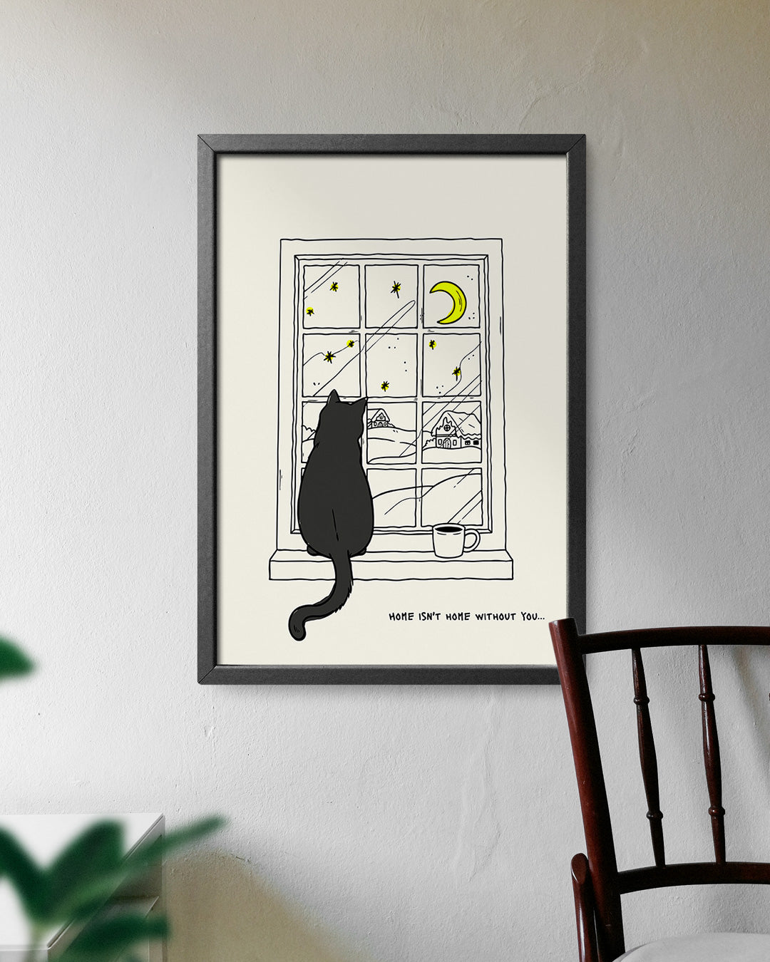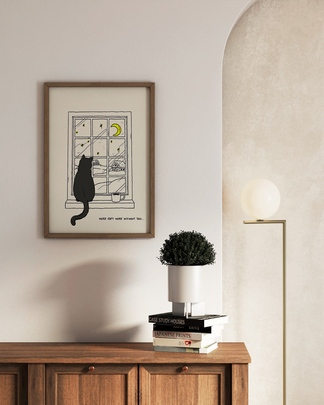 窓辺に座り、夜空を見つめながら飼い主の帰りを待つ黒猫を描いた、ミニマルで温かみのあるアートポスター。