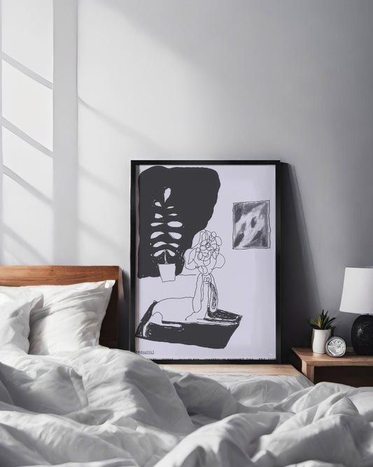シンプルでユーモラスな構図の中に、観る人の思考を刺激する挑発的なメッセージが込められています。インテリアとして飾れば、空間にひとさじのユーモアと知性を添えてくれる一枚です。