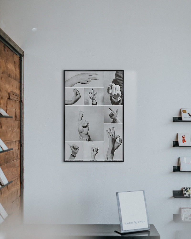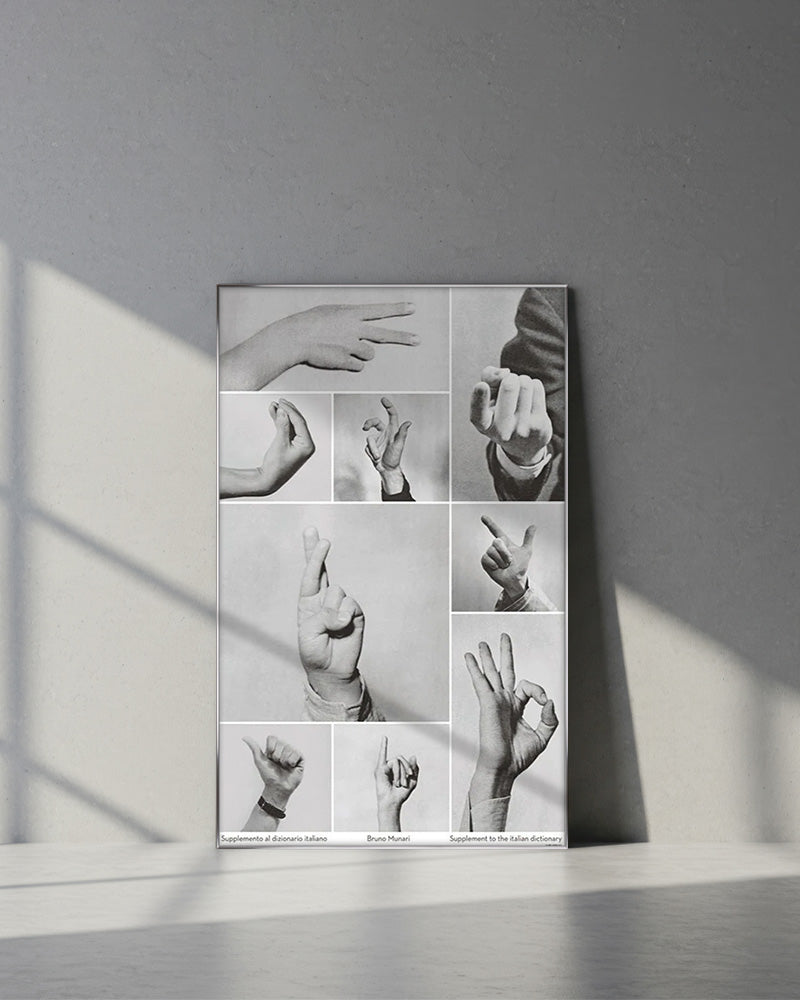 このポスターはムナーリが1962年に著した書籍『Supplement to the italian dictionary(イタリア語辞書の補足)』に掲載された「手のジェスチャー」をレイアウトしており、イタリア人が日常的に使うジェスチャーを写真で切り取り、まるで“もうひとつのイタリア語辞典”のようにまとめた作品です。