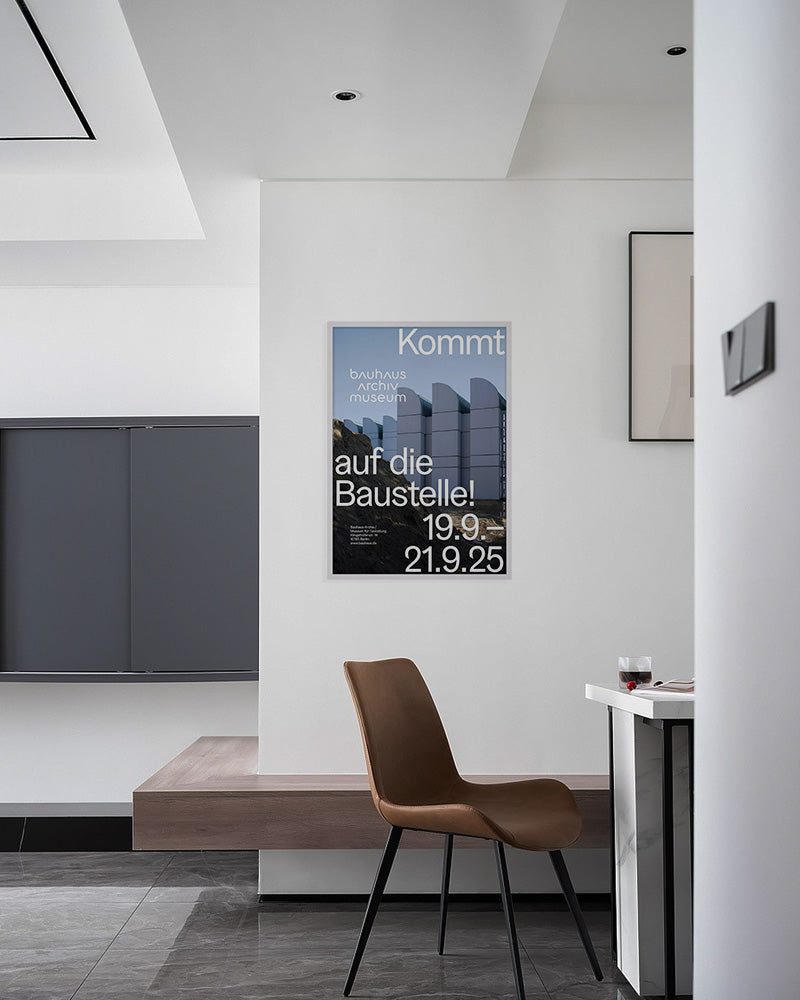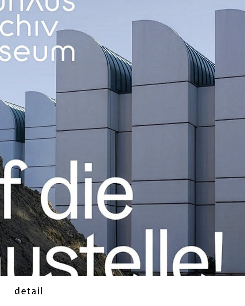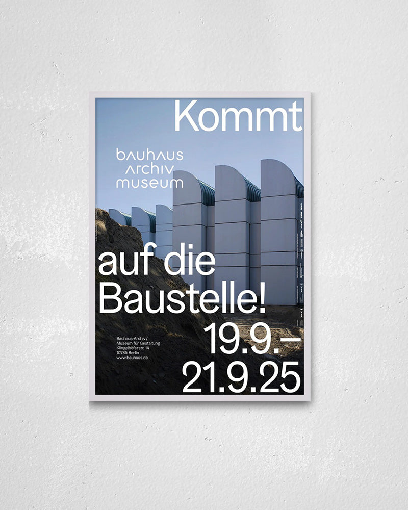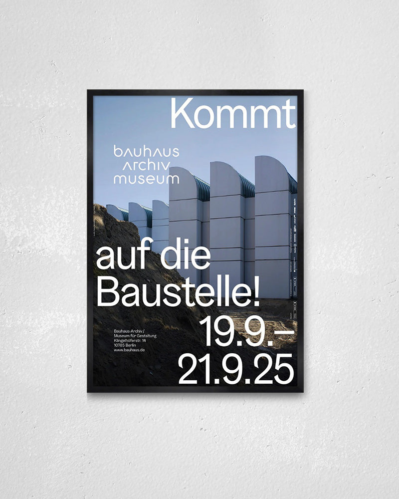 このポスターは、Temporary Bauhaus Archive で開催される「A Social Question」展のために制作されたビジュアルです。建設途中の建物を大胆に写した写真は、バウハウスらしいミニマルさと構造の美しさが際立つ一枚。
