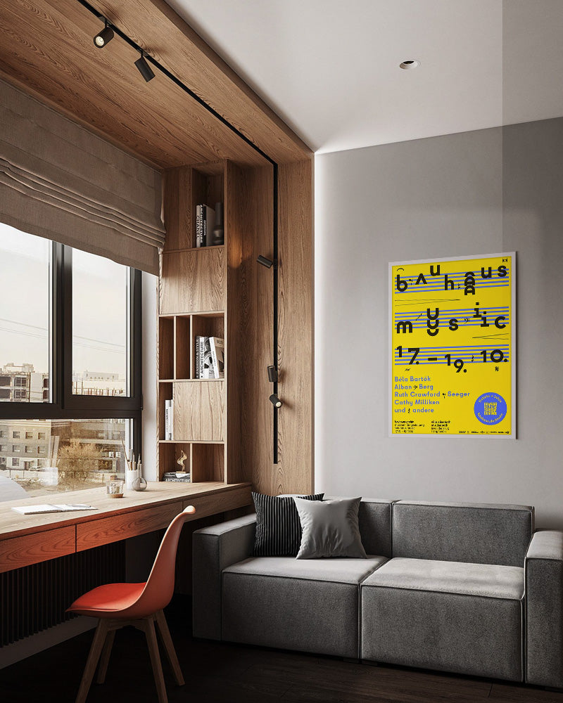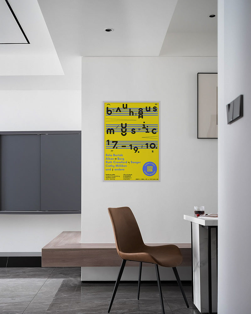 バウハウスらしいミニマルで構築的なライン、そしてリズムを刻むような文字配置は、見るだけで空間に活気と遊び心をプラス。モダンインテリア、北欧スタイル、クリエイティブなワークスペースとの相性も抜群です。