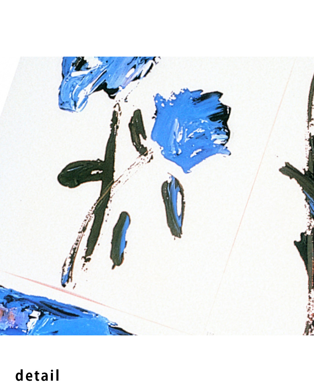 鮮やかなブルーを中心とした色面と余白のバランスが美しく、空間に静かなリズムと奥行きをもたらします。