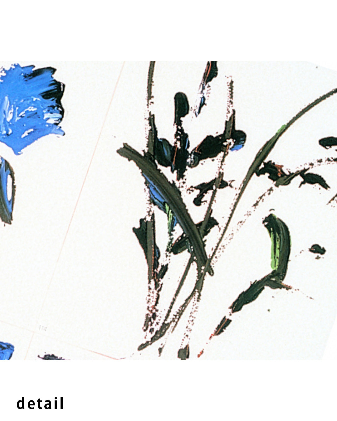 作品は「Pots de Fleurs(鉢植えの花)」シリーズの1枚。大胆な筆致で描かれた花と鉢のモチーフは、写実から離れた自由な表現によって、絵画そのものの存在感を際立たせています。